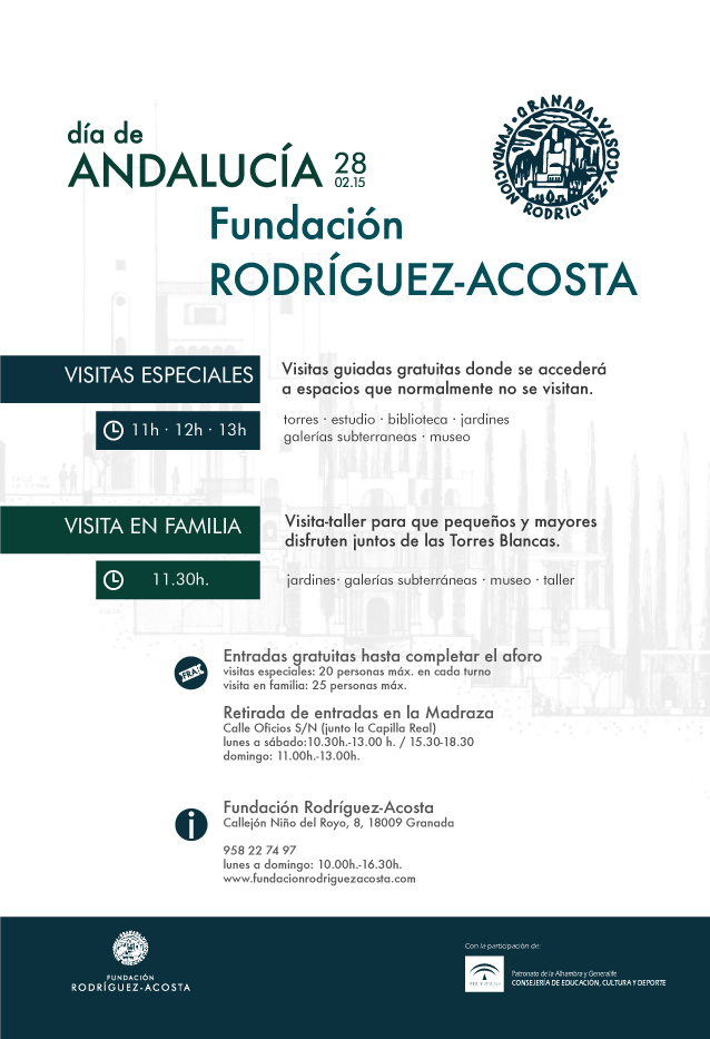 El sábado 28 de febrero, la próxima semana, celebraremos el día de Andalucía con unas «visitas espaciales» al carmen de la Fundación y una «visita-taller» como actividad en familia. Todas ellas serán gratuitas, hasta completar aforo; los interesados en participar, deben recoger previamente su ticket de entrada (1 por persona) en el Palacio de la Madraza, en el horario de visitas (de 10:00 a 18:30, de lunes a sábados. Los domingos de 11:00 a 13:00 h.). Estarán disponibles desde mañana viernes 20 de febrero.