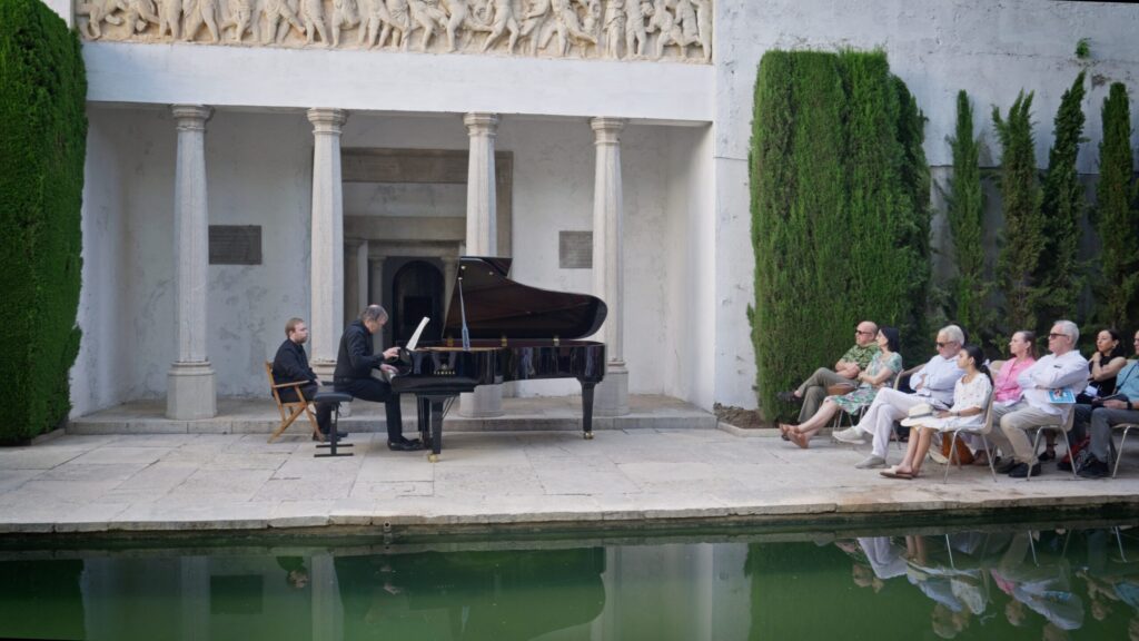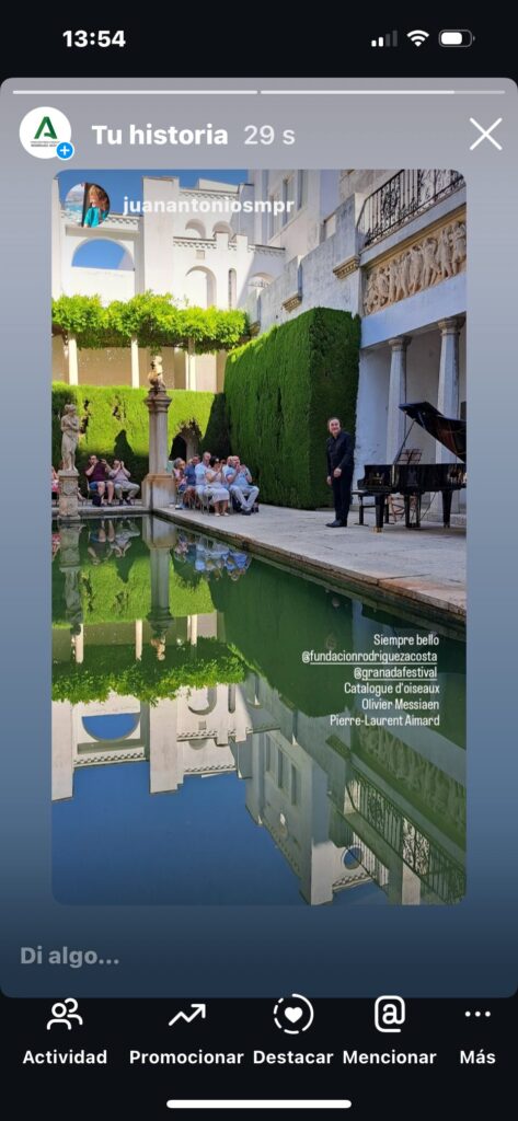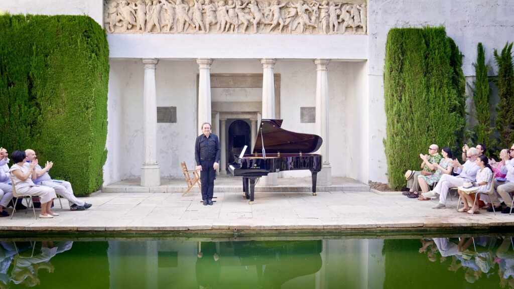 El pasado Lunes 7 de julio, se celebró en el Patio de Venus del carmen de la Fundación una parte del concierto de piano que se interpretó en diversas sedes de la colina del Mauror y la Alhambra. El pianista Pierre-Laurent Aimard, fue el encargado de interpretar parte de Catalogue d’Oiseaux (Catálogo de aves. 1956-1958) de Olivier Messiaen (1908-1992), una obra llena de matices y modernidad que entroncaba con la arquitectura y el paisaje del jardín de la Fundación