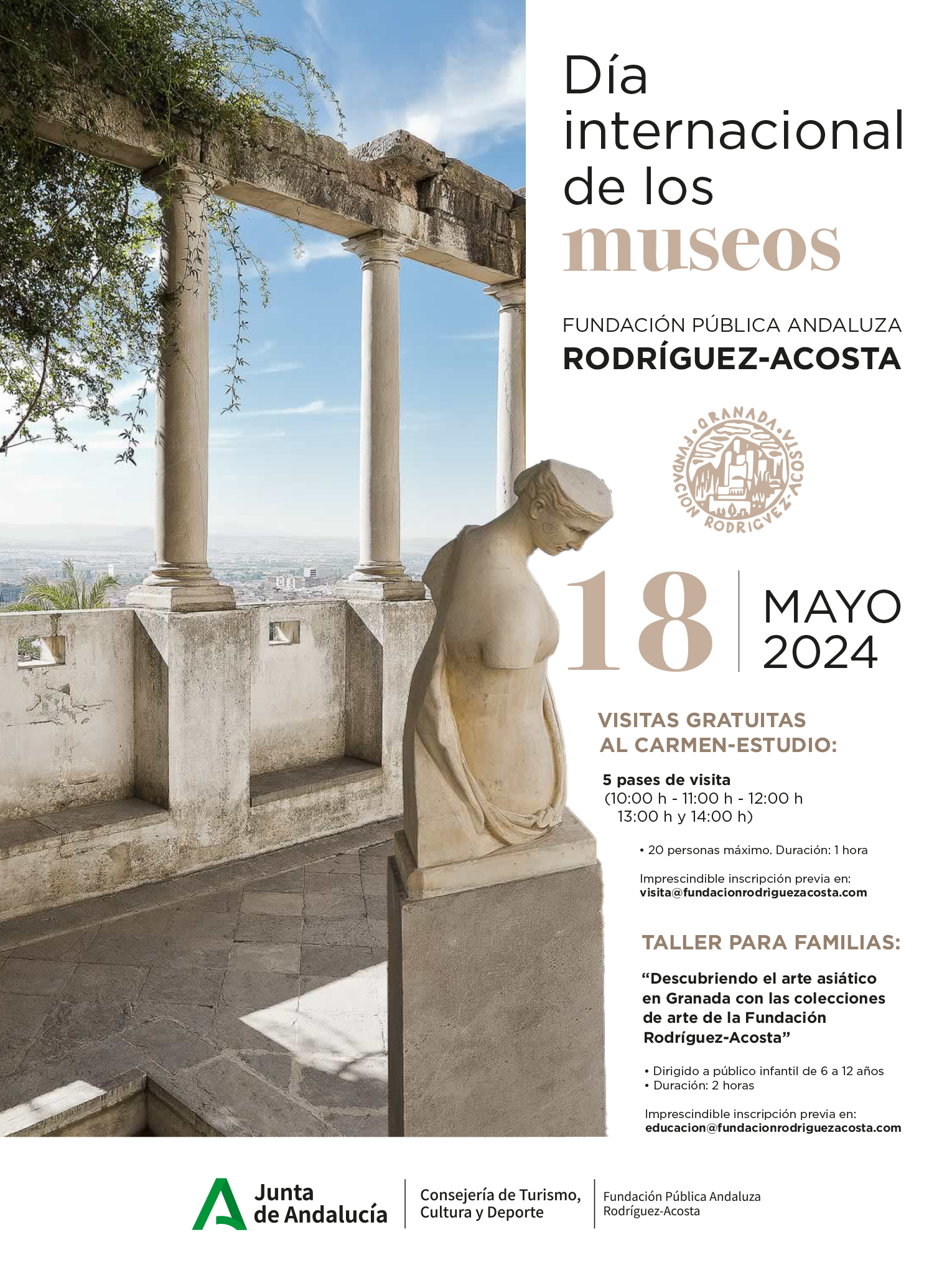 - Taller Descubriendo el arte asiático en Granada con las colecciones de arte de la Fundación Rodríguez-Acosta (11:30 a 13:30 h.) Taller para familias de 2 horas de duración, dirigido al público infantil entre los 6 y 12 años, en el que se conocerán algunas de las piezas de las colecciones de arte de la Fundación que nos invitarán a que viajemos a China, India y Japón, hablaremos de coleccionar objetos, y nos divertiremos creando piezas muy diversas inspiradas en el lejano Oriente. Aforo máximo de 25 personas. IMPRESCINDIBLE reserva previa en: educacion@fundacionrodriguezacosta.com