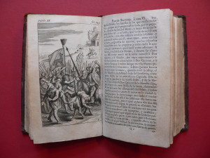 Es la Vida y hechos del ingenioso hidalgo Don Quixote de la Mancha compuesta por Miguel de Cervantes Saavedra impresa en dos volúmenes, en Lyon, en 1736, reproduce la edición de Bruselas de 1662 y está ilustrada con “diferentes estampas muy donosas y apropiadas à la materia”
