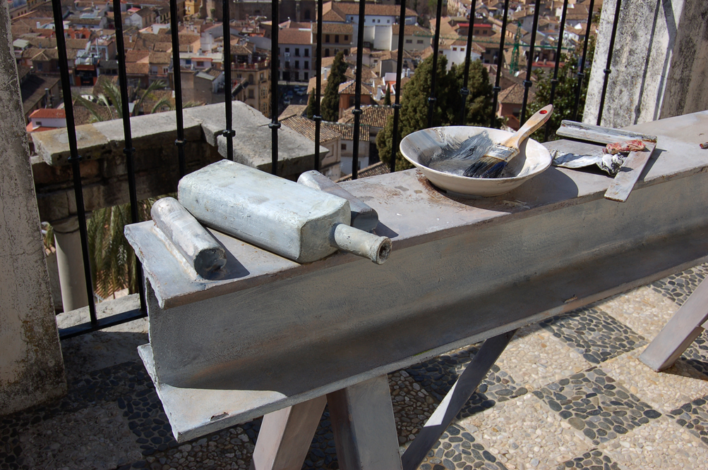 La muestra que se podrá visitar hasta el 4 de junio, está compuesta por diversos conjuntos de obras en sus tres sedes. En la Fundación podremos contemplar unas composiciones escultóricas que son de sus últimas producciones: esculturas en hierro, aluminio, bronce y madera que pertenecen a la última etapa de su creación, desde 2011 a 2015. En sus frecuentes visitas a una herrería, Carmen Laffón fue descubriendo posibilidades en los objetos que articulan la práctica cotidiana del taller. De ahí surge La herrería. Las obras que la componen oscilan entre la escultura y el ensamblaje, puesto que integran objetos ajenos al arte, hallados y elegidos por la autora. Conforman este apartado piezas como Caballetes con palos y vigas, La cuba o Caballetes con elementos verticales.
