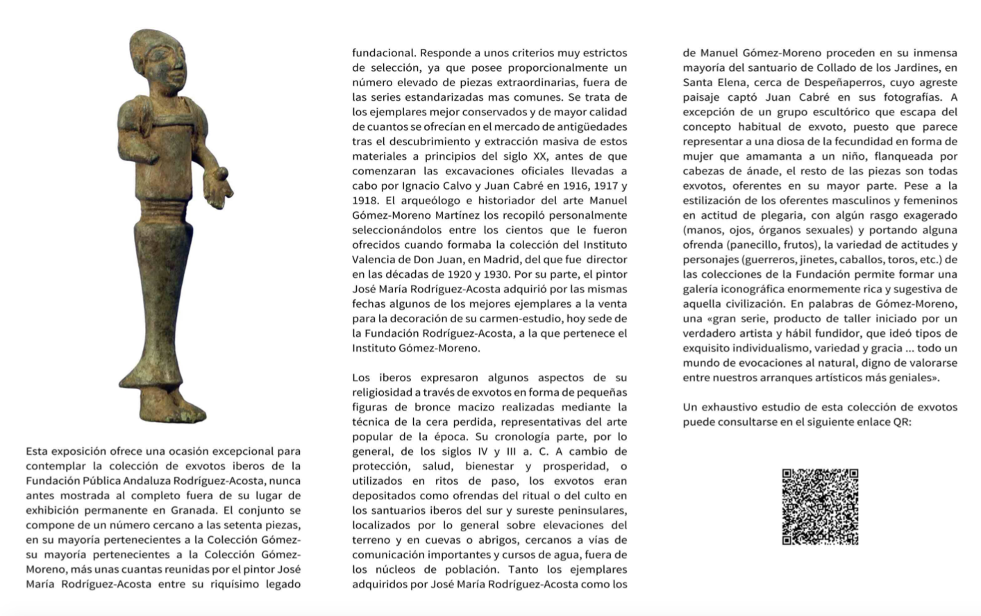En ella se podrán ver hasta el 5 de junio, los exvotos íberos de la Fundación Rodríguez-Acosta, que en su mayoría son parte de la colección Gomez-Moreno y proceden del santuario de Collado de los Jardines en Despeñaperros (Jaén). Solo 3 de las casi setenta piezas que se exponen, son de la colección Rodríguez-Acosta; para estos tres casos se presupone una procedencia similar; aunque no conocemos el lugar del que fueron recogidos, por sus características deben ser de algún santuario de la misma zona.