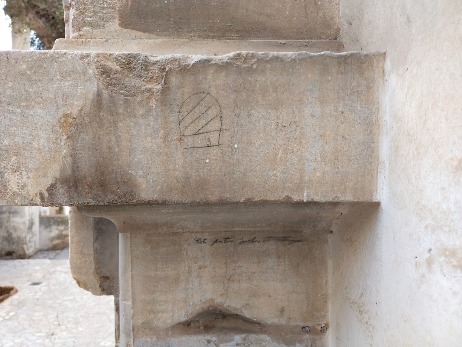 En el arco de acceso al criptopórtico desde el jardín de Baco, y refiriéndose al mismo, aparece escrito a lápiz, bajo el esquema de un arco, «Este patio jueves 5 de mayo». Tras buscar en las aplicaciones correspondientes (algoritmo de Zeller), se ha concretado que en 1921 se encontraba esa correspondencia.