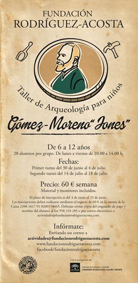 Por fin tenemos ya diseñados los folletos de los dos talleres de verano que vamos a realizar este mes de julio en la Fundación. Nuestro clásico, el «taller de artes plásticas» va a alternarse con un taller de arqueología para niños, que hemos titulado «Gómez-Moreno Jones», haciendo un guiño a la vertiente arqueológica de Manuel Gómez-Moreno Martínez; en él que se tratarán aspectos básicos del trabajo de campo y de trabajo de laboratorio arqueológico.