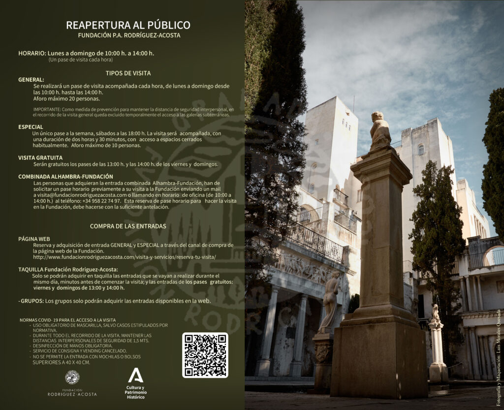 – Las personas que adquieran la entrada combinada Alhambra-Fundación, han de solicitar un pase horario previamente a su visita a la Fundación enviando un mail a visita@fundacionrodriguezacosta.com o llamando en horario de oficina (de 10:00 a 14:00 h.) al teléfono: +34 958 22 74 97. Esta reserva de pase horario para hacer la visita en la Fundación, debe hacerse con la suficiente antelación.