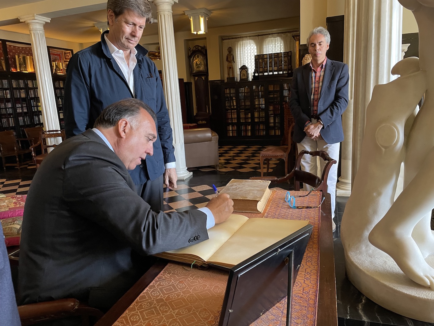 La visita ha estado atendida por nuestro Gerente Íñigo Entrala Bueno, que ha estado apoyado por el personal de la Fundación. El recorrido, ajustado al tiempo de que se disponía, ha tenido como punto de inicio y recepción la Biblioteca del carmen-estudio. En este emblemático lugar de nuestra sede, se ha invitado al Consejero a firmar en el libro de firmas de la Fundación que inauguró el propio José María Rodríguez-Acosta en el año 1930, recién concluida su obra arquitectónica.