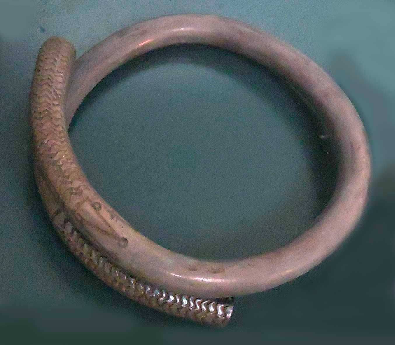Brazalete o Ajorca formado por una barra cilíndrica de plata con los extremos decorados con grabados de zig-zag y picos de punteado. Doblado en forma de brazalete grande. / Extraído de: A.A.V.V.: Instituto Gómez-Moreno (catálogo). Granada, 1992, p. 203.