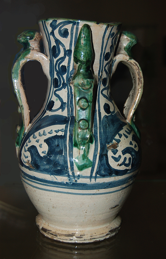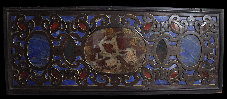 Puerta de armarito o costado de un arca, trabajada en ébano calado con inscrustaciones de jaspe y lapsislázuli en las zonas de reserva. / Extraído de: A.A.V.V.: Instituto Gómez-Moreno (catálogo). Granada, 1992, p. 242.