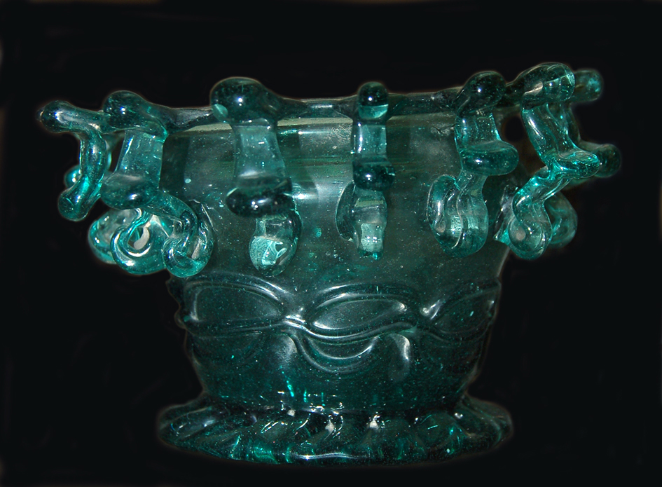 Cestillo de vidrio soplado de pasta verdosa, tipica de las producciones de Castril (Granada), con decoración sobrepuesta de crestas y asitas en misma pasta. Su forma es similar a la de un pequeño mortero. / Extraído de: A.A.V.V.: Instituto Gómez-Moreno (catálogo). Granada, 1992, p. 241.