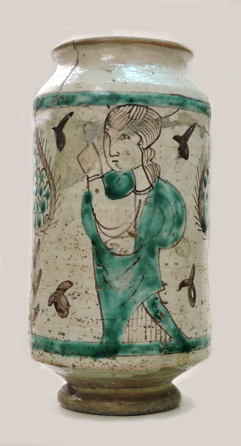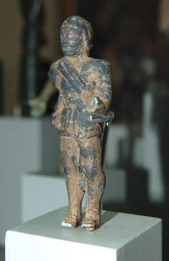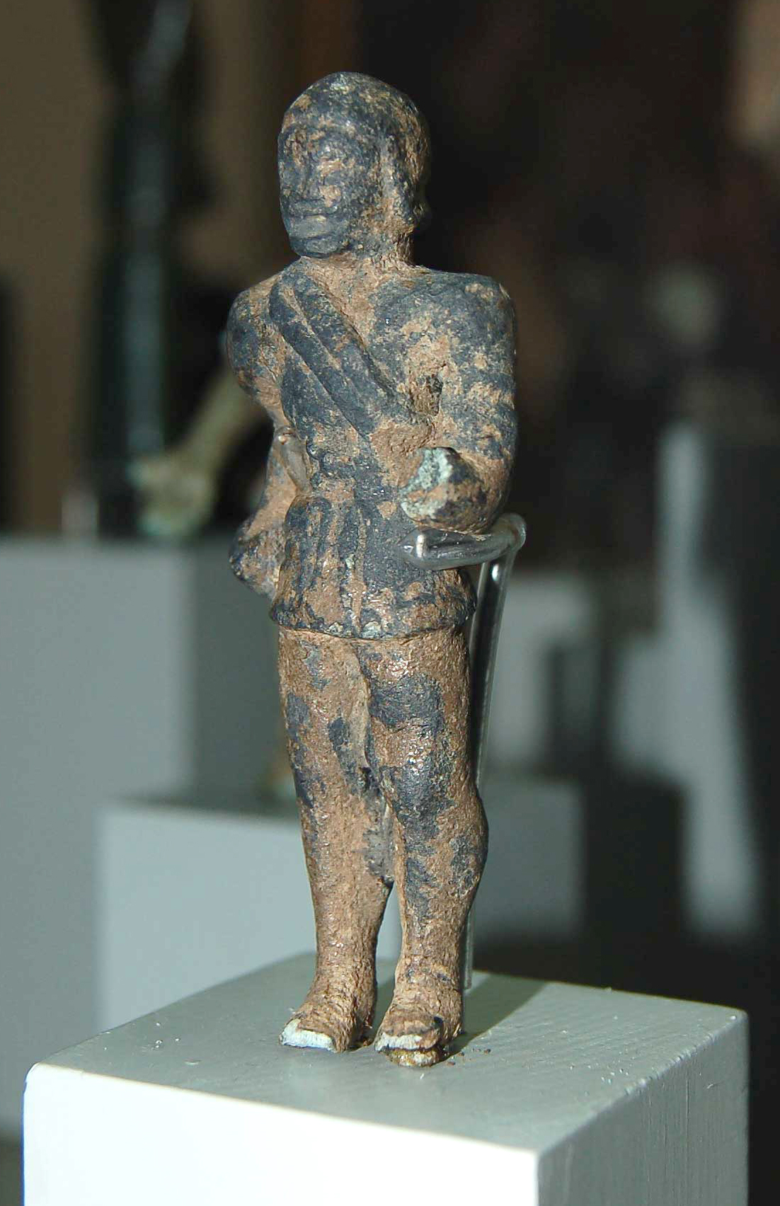 Exvoto masculino de túnica corta con escote en pico, mangas por encima de los codos y ceñida a la cintura. A medio esconder en el costado izquierdo guarda un puñal de antenas. De la espalda cuelga una caetra con umbo marcado. Pátina negruzca, muy desgastada, que se deja ver bajo una gruesa capa de concreciones que afectan a gran parte de la superficie de la pieza. Trabajo de mediana calidad. Bien proporcionada, aunque achatada. Respeta, de forma general, el eje de simetría axial.Cabeza redonda, cubierta por un casco liso con reborde cervical que cubre la totalidad de la misma, dejando solo libre la cara. Los rasgos del rostro son poco nítidos: ojos pequeños, que se identifican por unos huecos de extracción del metal, mientras que la boca y la nariz se marcan por medio de una incisión horizontal, más gruesa en el caso de la boca. Cuello casi inapreciable que une en unos hombros rectos y muy desarrollados, que configuran una espalda muy ancha. Viste túnica corta de cuello en pico y mangas por encima del codo. Parece ceñida a la cintura por medio de un cinturón casi imperceptible, del que, escondido en el costado izquierdo, prende un puñal de antenas. En la zona central de la cintura caen dos gruesos cordones verticales y paralelos. A la espalada, de un doble cinto, cuelga una pequeña caetra de umbo marcado. Brazo derecho doblado y pegado a la cadera, con la mano cerrada, que deja un hueco posiblemente para sujetar otra arma, como una lanza. El izquierdo dobla hacia delante del que falta la mano. Piernas gruesas con los muslos y pantorrillas muy musculosas, unidas hasta bajo los gemelos. Pies separados, pequeños y asimétricos, más grande el derecho que el izquierdo. Plano de proyección de la mirada al frente. Iconografía relacionada con la exposición pública de un determinado estamento social. (Extraído de: Rueda, 2012: 276)