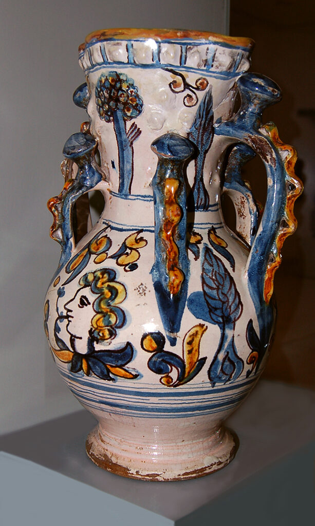 Jarra de cerámica vidriada en blanco, con decoración en azul, manganeso y melado. Con seis asas, dos grandes y cuatro pequeñas, rematadas en boliches y decoradas con una cinta ondulada en relieve color miel; las asas son azules. En el gollete, decoración de arbolitos, y en la panza, dos cabezas de caballeros entre otros elementos vegetales. / Extraído de: A.A.V.V.: Instituto Gómez-Moreno (catálogo). Granada, 1992, p. 224.