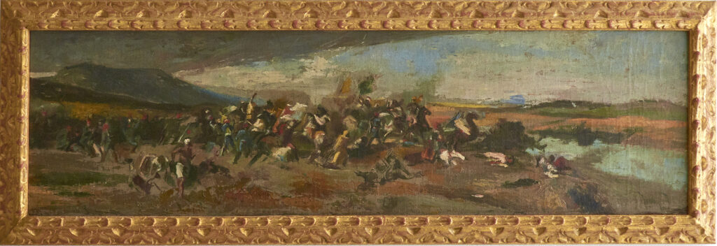 En un campo con colinas y sierra al fondo, grupos de españoles y marroquíes traban combate junto a un río. En el centro, lucha de jinetes; a la izquierda, la infantería española. Se considera el primer boceto para un cuadro sobre sobre la batalla de Wad-Ras que debería formar parte de la serie de «cuatro grandes lienzos y seis medianos referentes todos a episodios, acontecimientos y vistas de la guerra [de Marruecos]» que Fortuny se comprometió a hacer para la Diputación de Barcelona en enero de 1860 y que jamás llegó a realizar, quedando como únicos testimonios -en sentido estricto- del encargo, el lienzo inconcluso con La batalla de Tetuán del Mseo de Arte Moderno de Barcelona y bocetos para La Batalla de Castillejos y La Batalla de Wad-Ras. De este último Fortuny realizó tres bocetos: el que se conserva en nuestro Instituto Gómez-Moreno está fechado en 1861 y realizado por tanto en Roma en donde residió durante todo ese año. / Extraído de: A.A.V.V.: Instituto Gómez-Moreno (catálogo). Granada, 1992, p. 143 / Foto: Luis Morales Quesada