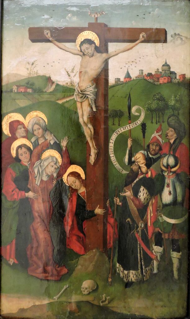 La composición está claramente centrada por la figura de Cristo en la cruz, muerto. A la izquierda la Virgen sostenida por San Juan junto con dos santas mujeres y la Magdalena abrazada a la cruz: a la derecha, en centurión con indumentaria oriental y tres sayones. A los pies de la cruz, calavera con el maxilar inferior desprendido y un fémur. Fondo de paisajecon colinas, campos cultivados y una ciudad. De la boca del centurión sale una filacteria con esta inscripción: «Vere hic homo filius dei erat». La atribución a este pintor (Jorge Inglés), fue hecha por D. Diego Angulo en una conferencia que no se recogió por escrito.Extraído de: A.A.V.V.: Instituto Gómez-Moreno (catálogo). Granada, 1992, p. 116.