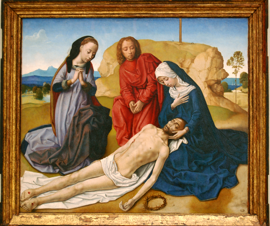 En esta composición se representa en el primer plano a Cristo que yace muerto tendido en el suelo sobre una sábana y con la cabeza recostada en el regazo de la Virgen. A su lado San Juan y María Magdalena lo contemplan arrollidados. Las figuras de la Virgen y San Juan se recortan ante la roca del Calvario que, rotunda y ocupando el plano medio, acapara el paisaje del fondo. Tras ella se abren dos lejanas perspectivas en las que árboles, aguas y montañas se integran en un paisaje diluido en tonos azulados. La atribución a Hugo van der Goes, sostenida debilmente por Mª Elena Gómez-Moreno, ha sido apoyada  por Elisa Bermejo y más recientemente por Pilar Silva Maroto. La existencia de varios arrepentimientos, visibles con rayos infrarrojos, inducen a estimarla original. No obstante, hay autores que consideran que se trata de una copia, muy fiel, del original -que suponen perdido- de van der Goes.Conserva el marco primitivo con enganches laterales que denotan su pertenencia a un triptico. Fue comprado en Gradada a comienzos del siglo XX a un particular del que no se tienen datos. / Extraído de: A.A.V.V.: Instituto Gómez-Moreno (catálogo). Granada, 1992, p. 114.
