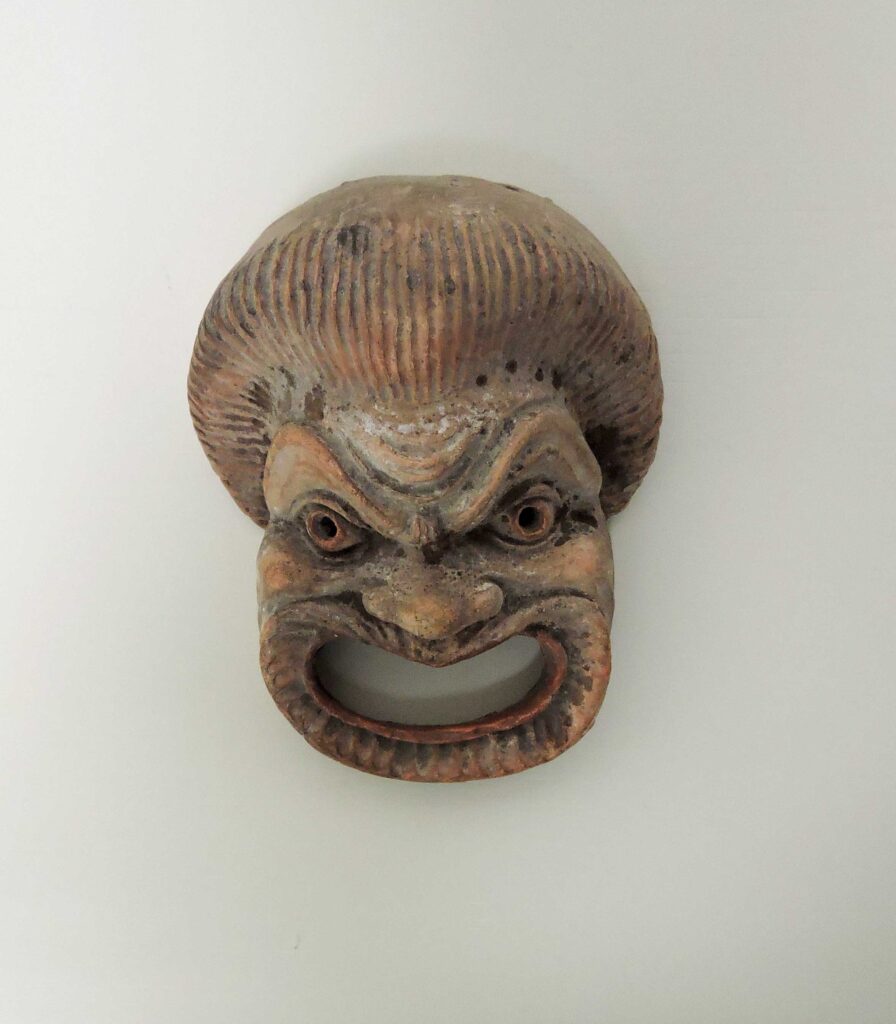 Pequeña máscara o carátula de cerámica (barro cocido), de pasta rosada muy fina, de la que no consta procedencia. Puede ser una máscara teatral, quizás alegoría de la Comedia, representada por una cabeza humana de pelo estriado, ceño fruncido, nariz ancha y amplia boca horadada. También pude tratarse de un vaciado en barro de un original en bronce o hierro, que pudiera ser parte de un conjunto mayor, de una puerta o de algún objeto de mobiliario./ Extraído de: A.A.V.V.: Instituto Gómez-Moreno (catálogo). Granada, 1992, p. 201.