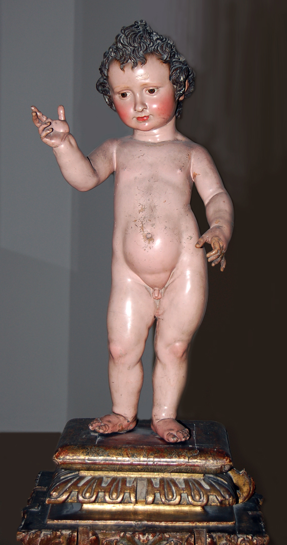 Este Niño Jesús, resuelto al estilo de la escuela barroca sevillana, tiene la especial caracteristica de ser de peltre (aleación de plomo, estaño y cobre) y ser una imagen para vestir (se cambiarían sus vestidos según el momento del año liturgico). Hasta nosotros ha llegado sin conservar ninguno de sus atuendos. La figura está encastrada, por espigas, en la peana que es de madera tallada y policromada, de cronología similar a la escultura.  Aparece en actitud de bendecir, con el cabello rizado especialmente agrupado en el centro de la cabeza, rasgo característico de la escuela de Juan de Mesa. / Extraído de: A.A.V.V.: Instituto Gómez-Moreno (catálogo). Granada, 1992, p. 183.