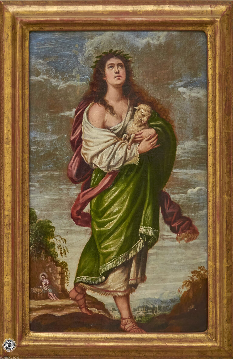 Laguna en primer término, con árboles y vegetación alrededor; a la izquierda toros bebiendo; al fondo, monte con casita. El celaje tormentoso reflejado en el agua, ocupa la mayor parte de la obra. Extraído de: A.A.V.V.: Instituto Gómez-Moreno (catálogo). Granada, 1992, p. 152