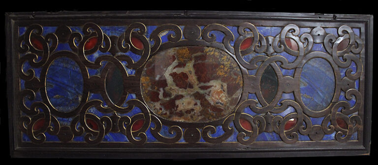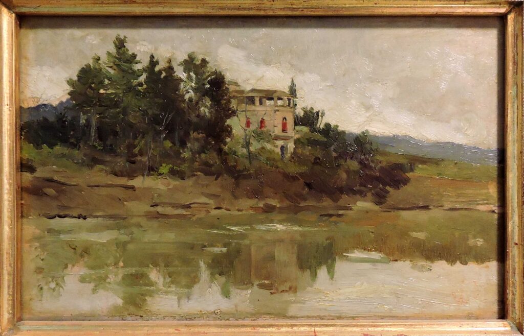 Casa a orillas de un río, rodeada de árboles. Al fondo, algunas montañas lejanas. El cielo está nublado pero luminoso. Es un boceto rápido, con predominio de los tonos verdes de los árboles que se reflejan en el agua, buen ejemplo de la pintura realista de paisaje de la que Carlos de Haes claro exponente en España. Extraído de: A.A.V.V.: Instituto Gómez-Moreno (catálogo). Granada, 1992, p. 142