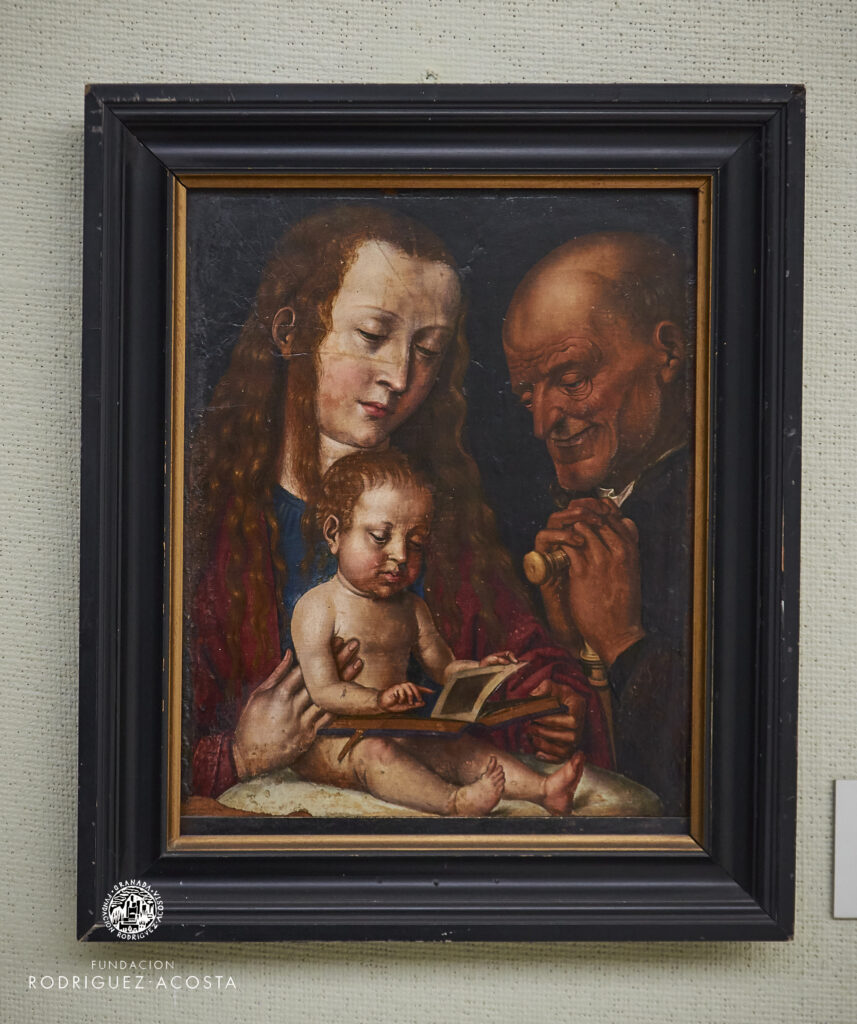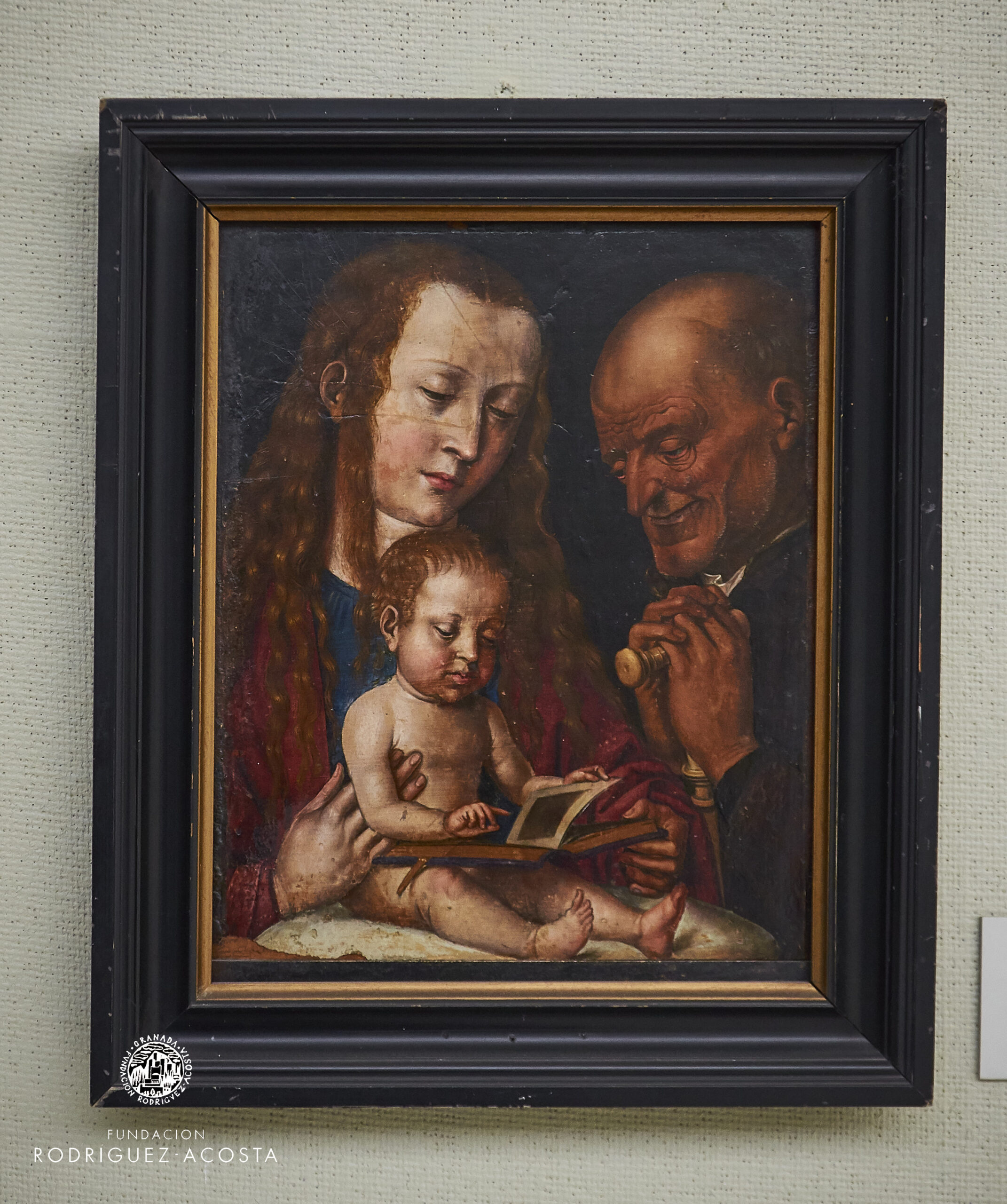 En esta composición simple, la Virgen está representada como una joven, sin toca y con cabello suelto que está sosteniendo al Niño desnudo y sentado sobre un cojín mientras hojea un libro. A la derecha San José, representado como un viejo calvo, asiste sonriente a la escena, con las manos cruzadas sobre una muleta. Las figuras destacan en un primer plano y están perfectamente recortadas sobre un fondo negro./ Extraído de: A.A.V.V.: Instituto Gómez-Moreno (catálogo). Granada, 1992, p. 117. / Foto: Luis Morales Quesada