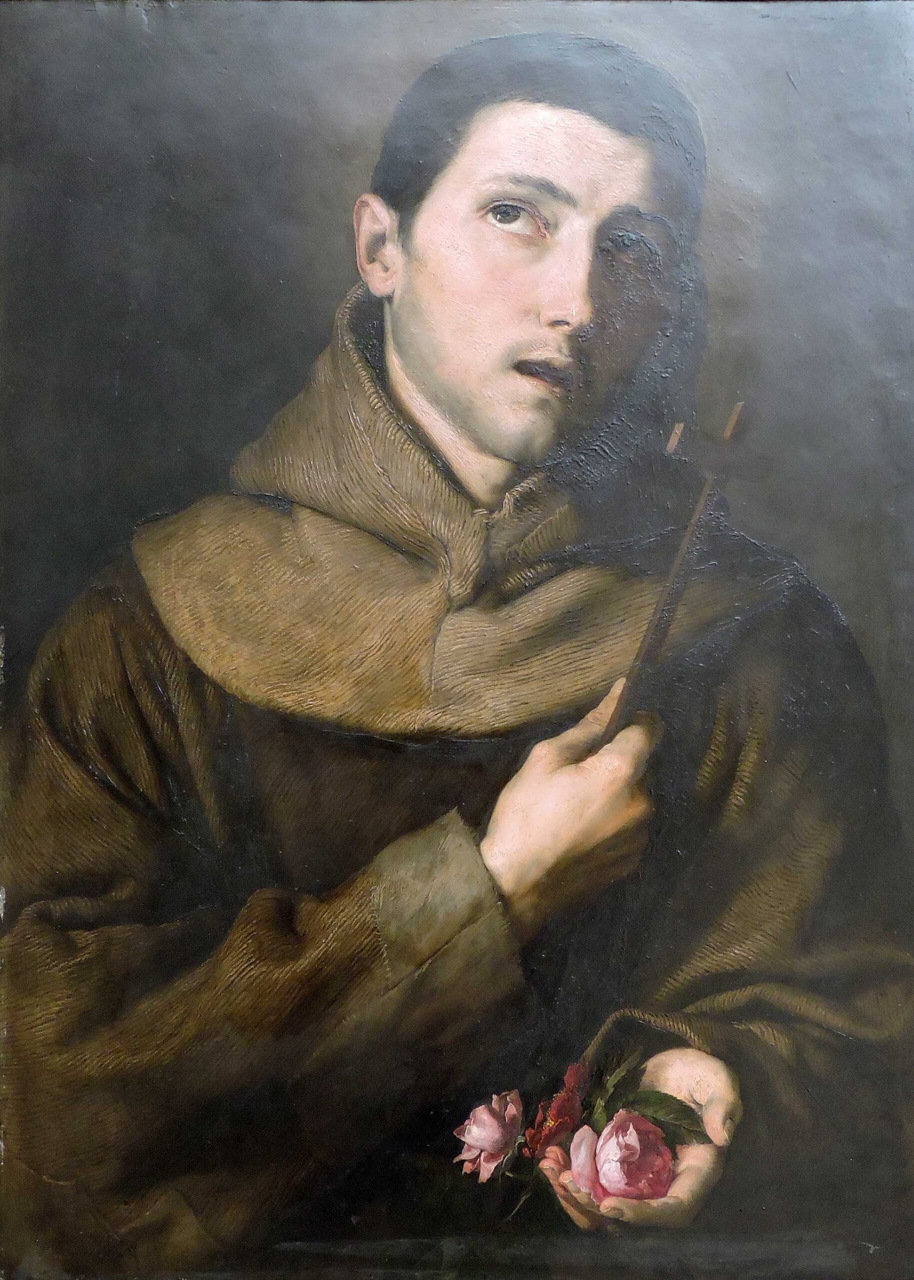 El santo, aparece representado de medio cuerpo y llevando el hábito franciscano, en actitud de elevar la mirada al cielo. En la mano izquierda muestra unas rosas y en la derecha sostiene una cruz. El fondo es neutro y liso, observándose muy bien las pinceladas, por su buen estado de conservación. Es excepcional por su soporte (plancha de cobre), que exigía una determinada técnica a la hora de su ejecución, en la que Ribera era un maestro. /Extraído de: A.A.V.V.: Instituto Gómez-Moreno (catálogo). Granada, 1992, p. 122