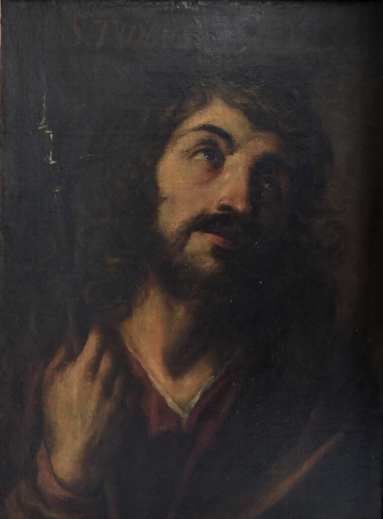 Este óleo sobre lienzo fue comprado por Manuel Gómez-Moreno en el Rastro de Madrid. En él encontramos un busto del apóstol de frente con la cabeza levemente vuelta hacia la derecha y con los ojos elevados al cielo con expresión extática. Con la mano derecha sostiene la alabarda, símbolo de su martirio. Inscripción: «S. TADEVS». La atribución dudosa la estableció Mª Elena Gómez-Moreno. / Extraído de: A.A.V.V.: Instituto Gómez-Moreno (catálogo). Granada, 1992, p. 130