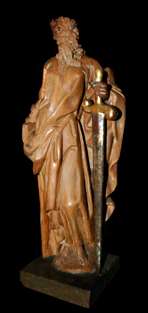 Escultura realizada en madera de pino, sin peana, que ha perdido la mayor parte de su policromía. San Pablo es representado en pie, sujetando con la mano izquierda la espalda del martirio que conserva su policromía dorada y roja. Es compañera de la escultura de San Pedro anterior. / Extraído de: A.A.V.V.: Instituto Gómez-Moreno (catálogo). Granada, 1992, p. 181-182