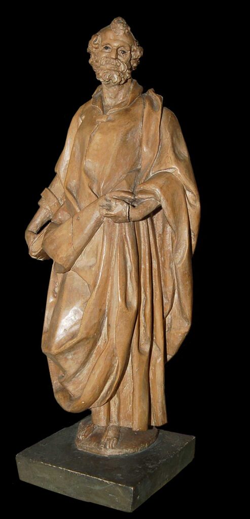 Escultura realizada en madera de pino, sin peana, que ha perdido la mayor parte de su policromía. El apóstol San Pedro, se representa de pie, con manto sujeto con la mano izquierda y en la derecha un libro. Seguramente formaría parte de un retablo. / Extraído de: A.A.V.V.: Instituto Gómez-Moreno (catálogo). Granada, 1992, p. 181