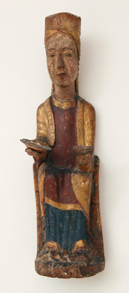 Esta representación de Santa Lucía, responde a las características habituales de la escultura románica-gótica, por su hieratismo y solución esquemática. Está resuelta en un bloque de madera del que únicamente sobresalen las manos y la cebeza, convertidas en las partes más vulnerables (han sido pegadas en algún momento reciente). La Santa está sentada en un trono, y sostiene en su mano derecha un plato en el que están los ojos, atributo de su martirio, y en la izquierda un libro. Viste túnica y mando de oro, con toca y corona. / Extraído de: A.A.V.V.: Instituto Gómez-Moreno (catálogo). Granada, 1992, p. 167.