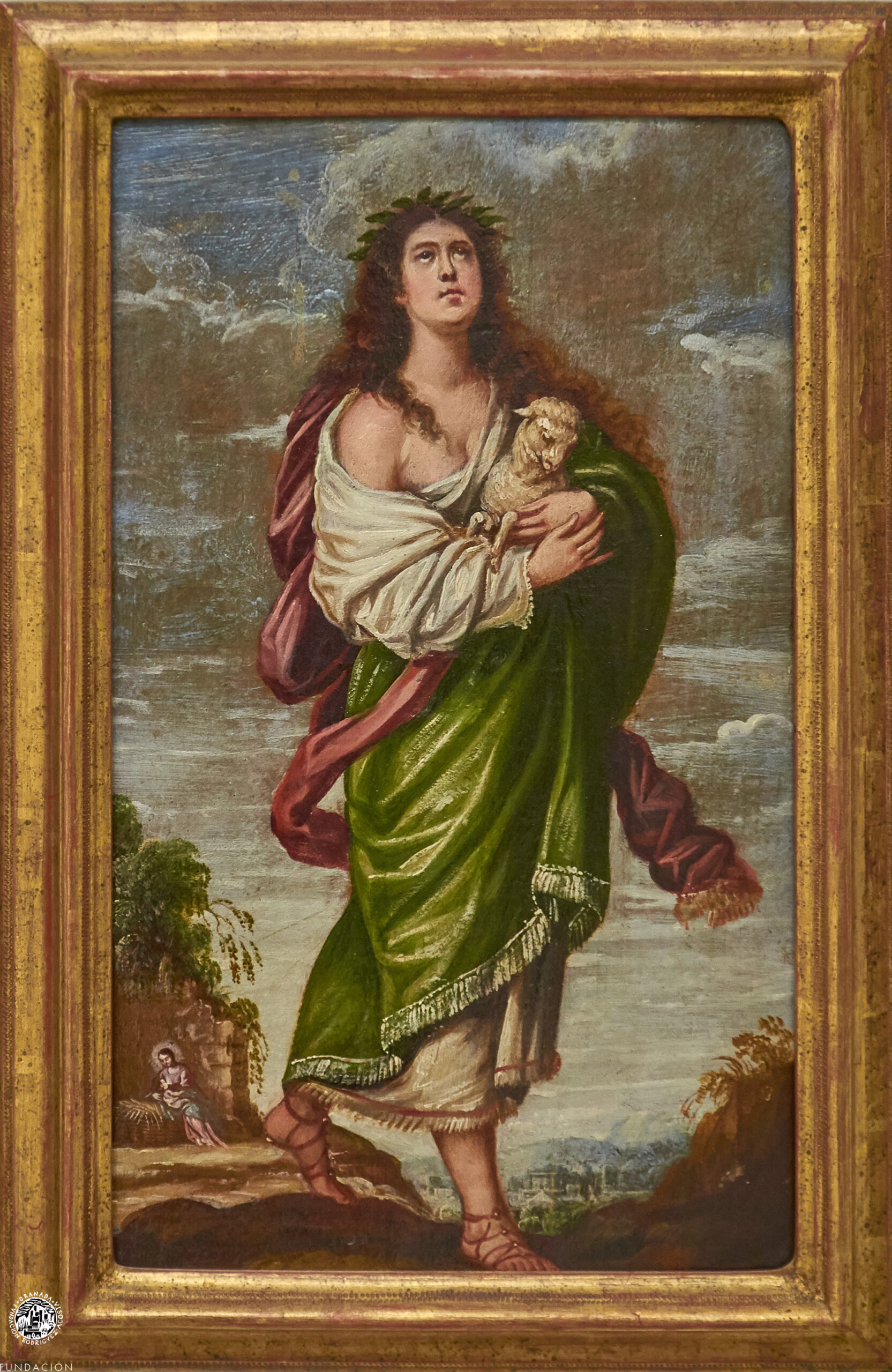 Figura femenina va caminando, coronada de laurel, lleva un cordero en brazos. En el fondo un paisaje de horizonte bajo, con una ciudad. A la izquierda, la Virgen y el Niño, como representación del Descanso en la Huida a Egipto. Se trata de la Sibila Europea, vaticinadora de la Matanza de los Inocentes, a la que hace referencia el cordero, símbolo de inocencia, y la Huida a Egipto, hechos bíblicos unidos inseparablemente. María Elena Gómez-Moreno atribuía esta pintura a Alonso Cano, pero esta posibilidad no tuvo mucha repercusión y recientemente se han vinculado con más fortuna, a la Escuela de Zurbarán. Adquirida en Granada por Manuel Gómez-Moreno. / Extraído de: A.A.V.V.: Instituto Gómez-Moreno (catálogo). Granada, 1992, p. 128 / Foto: Luis Morales Quesada