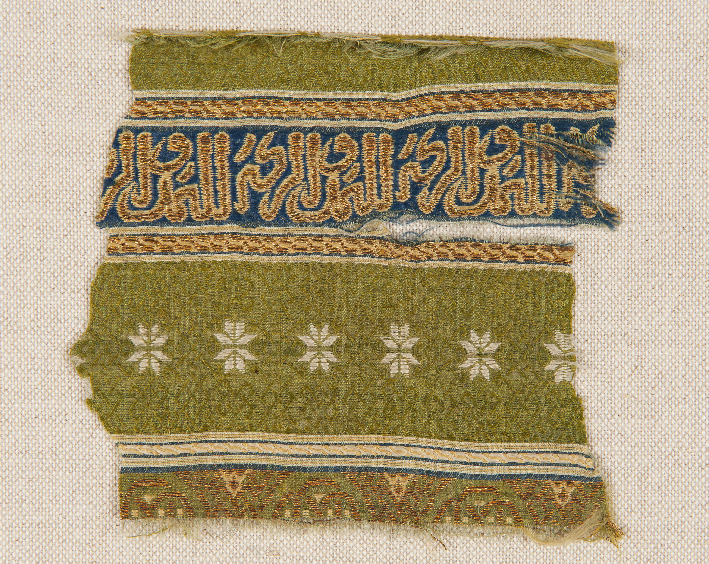 Fragmento del traje mortaja de la reina Berenguela. Berenguela I de Castilla, nace en Segovia, el 1 junio de 1180, y es enterrada en el Monasterio de las Huelgas, Burgos, el 8 de noviembre de 1246. Fue Reina de Castilla en 1217 y reina consorte de León entre 1197 y 1204. Es la hija primogénita del rey castellano Alfonso VIII y de su esposa, Leonor de Inglaterra, fundadores del Monasterio de las Huelgas.Aquí presentamos cuatro fragmentos de tejido, pertenecientes a una misma pieza, alguno de ellos de muy pequeño tamaño, que se encontró en el ataúd de la reina Berenguela, junto a su momia; posiblemente fuese del traje (GÓMEZ-MORENO, 1949, p. 30-31). Tal como señala el propio Gómez-Moreno, este ataúd presentaba evidentes signos de alteraciones, consecuencia del expolio y destrozo del que fueron objeto la mayoría de los enterramientos de Las Huelgas, por los franceses, bajo la invasión napoleónica. Como apunta Amparo López, se trata de un tafetán liseré haciendo juegos de lacerías, rosetas de ocho puntas y epigrafía; lleva una sola urdimbre de seda blanca de torsión “Z”. Varias tramas de tafetán liseré sin torsión dos tonos de verde, una azul y otra rosada y también una trama de oropel. En la franja de la epigrafía la técnica constructiva cambia y se convierte en taqueté.La decoración de esta pieza en la que predomina el color verde de los fondos, se dispone en bandas horizontales, en las que van alternándose diferentes temas decorativos: banda de flores blancas de ocho hojas picudas sobre fondo verde de relieve menudo geométrico; banda de rosetones con minúscula estrella central, separados por flores de ocho hojas picudas en dorado y blanco sobre verde; nuevamente banda de flores blancas, antes de la banda de epigrafía cursiva que repite la misma grafía, unas veces en dorado sobre fondo azul, y otras en blanco sobre fondo dorado. Las bandas van separadas por tres listillas lisas, blancas y azules; la lista central es una cadeneta o cordón simple de dos cabos, que resulta especialmente visible en las zonas de enmarque de la epigrafía. La organización geométrica del diseño subyace tanto en las bandas de flores como en las de flores y rosetones, tanto en sus aspectos más evidentes, como en la disposición del dibujo en relieve que se organiza en sus fondos.La pieza de la que proceden estos fragmentos, conservada en el Museo de Telas medievales del Monasterio de las Huelgas, fue restaurada y analizada, arrojando entre los tintes empleados para su fabricación, colorantes como el índigo (azul), y el gualda (amarillo), y un alto porcentaje de oro (88 %), frente a la plata (5%), en los hilos entorchados (HERRERO CARRETERO.: 1988, p. 98).Esta pieza es similar y considerada de la misma serie (HERRERO CARRETERO, C, 1988, p. 98) que la del ataúd de Fernando de la Cerda (1225-1275).Más información en el catálogo «A la luz de la seda»