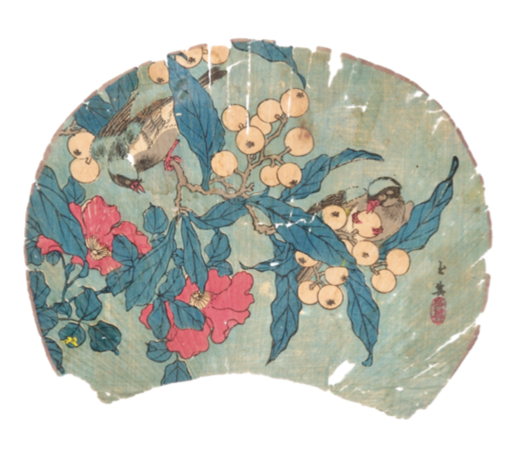 En Japón, los abanicos, tanto los uchiwa como los desplegables u ôgi, son utilizados tanto por hombres como por mujeres, generalmente en las estaciones cálidas. Los hechos de bambú y papel eran los más baratos y asequibles y, por lo tanto, utilizados por las clases populares. En el periodo Meiji (1868-1912) la fascinación por los objetos japoneses en Occidente hizo que se exportaran a Europa muchos abanicos uchiwa impresos con paisajes y temas japoneses. A diferencia de las porcelanas, los bronces o las lacas, estos objetos podían adquirirse en los comercios de las capitales europeas a precios irrisorios.Este elegante uchiwa-e, xilografía destinada al país de un abanico, fue diseñado por el paisajista Gyokuei a comienzos del siglo XX. El dibujo de dos pájaros en una rama con flores y frutos se define con precisión sobre los delicados colores azules, gris, rojo y amarillo de la estampa.Bajo la denominación kachô-ga se designa en japonés toda aquella pintura que tiene por tema las escenas naturales protagonizadas por flores y pájaros. Lejos de ser una temática menor, las escenas de flores y pájaros corresponden a la pintura culta y sus orígenes se remontan a la pintura clásica china. Este tema reapareció con gran vigor en la escuela de grabado popular Ukiyo-e a lo largo del siglo XIX, al mismo tiempo que se produjo un gran interés por el paisaje y las vistas de lugares famosos. En los uchiwa-e, grabados destinados a estampar los países de papel de los abanicos no desplegables o uchiwa, las escenas de flores y pájaros fueron también muy habituales. / Bibliografía: ALMAZÁN TOMÁS, D.: «Uchiwá-e. Periodo Meiji (1868-1912), principios S. XX. Japón», en LÓPEZ GUZMÁN, R.; RUIZ GUTIÉRREZ, A.; SORROCHE CUERVA, M.A. (Coord. científica): Oriente en Granada (Catálogo Exposición). Granada, 2008, pp.: 66-67