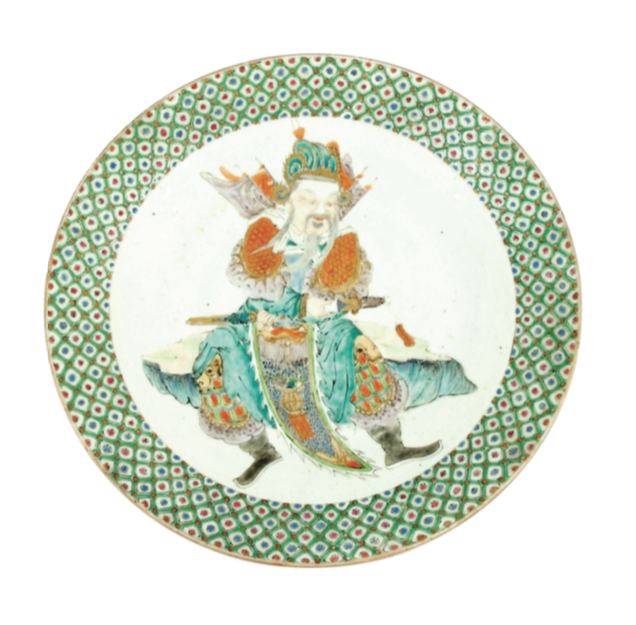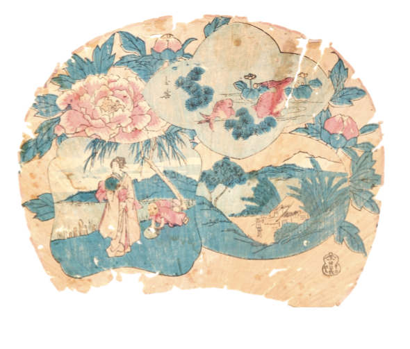 Desde finales del siglo XVIII, dentro de la popular escuela de grabado Ukiyo-e, apareció un formato de estampa, producida técnicamente mediante xilografías policromas, para producir de manera económica países de abanico de papel. Estas estampas se denominan uchiwa-e, esto es, estampas para abanicos rígidos. Uchiwa es el término japonés para referirse al abanico no desplegable, que en España, por influencia fili- pina, denominamos pai-pai. Este tipo de abanico está documentado en Japón desde el siglo V de nuestra era, fechas en las que llegó de China. En el periodo Kamakura (1185-1333) los uchiwa cambiaron su diseño rectangular por el actual redondeado. La decoración de los abanicos fue realizada por destacados pintores, sobre superficie de seda. A partir del periodo Edo (1615-1868), ya sobre papel, encontramos la huella de los grandes maestros del grabado ukiyo- e, como el célebre Utagawa Hiroshige(1797-1858). Los artistas del ukiyo-e realizaron este tipo de obras, diseñadas específicamente para ser estampadas, recortadas y pegadas en un ligero armazón de bambú. Paisajes, escenas de género, hermosas mujeres o famosos actores de Kabuki fueron los temas más frecuentes en estos abanicos.El autor de este uchiwa-e es menos conocido, Gyokuei, que trabajó durante la primera década del siglo XX. Gyokuei se especializó en paisajes adaptados al formato de los abanicos. Este país de abanico presenta una abigarrada superposición de escenas en una escasa gama de azules y rosas. Sobre un fondo vegetal con unos crisantemos (kiku) aparece, a la izquierda, una escena galante con una reverencia a una geisha. Por otro lado, a la derecha, encontramos un paisaje costero. Y, finalmente, en la parte superior, se representa un estanque con unos peces de colores o kingyo. / Bibliografía: ALMAZÁN TOMÁS, D.: «Uchiwá-e. Periodo Meiji (1868-1912), principios S. XX. Japón», en LÓPEZ GUZMÁN, R.; RUIZ GUTIÉRREZ, A.; SORROCHE CUERVA, M.A. (Coord. científica): Oriente en Granada (Catálogo Exposición). Granada, 2008, pp.: 66-67