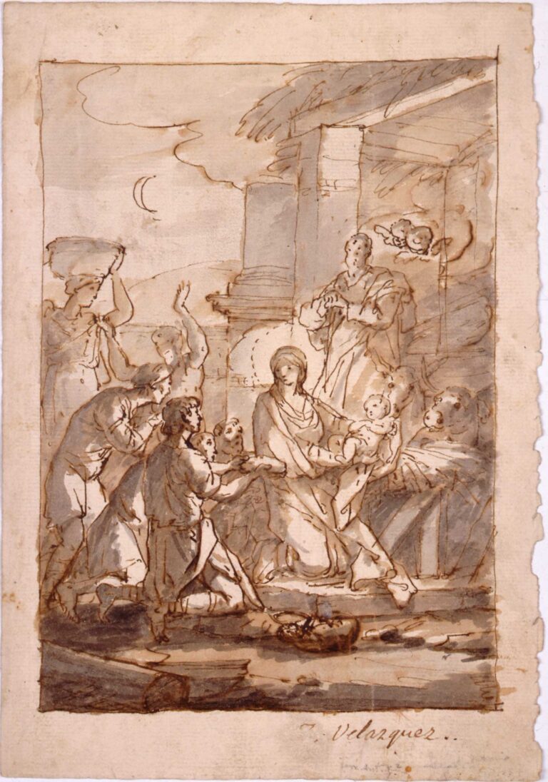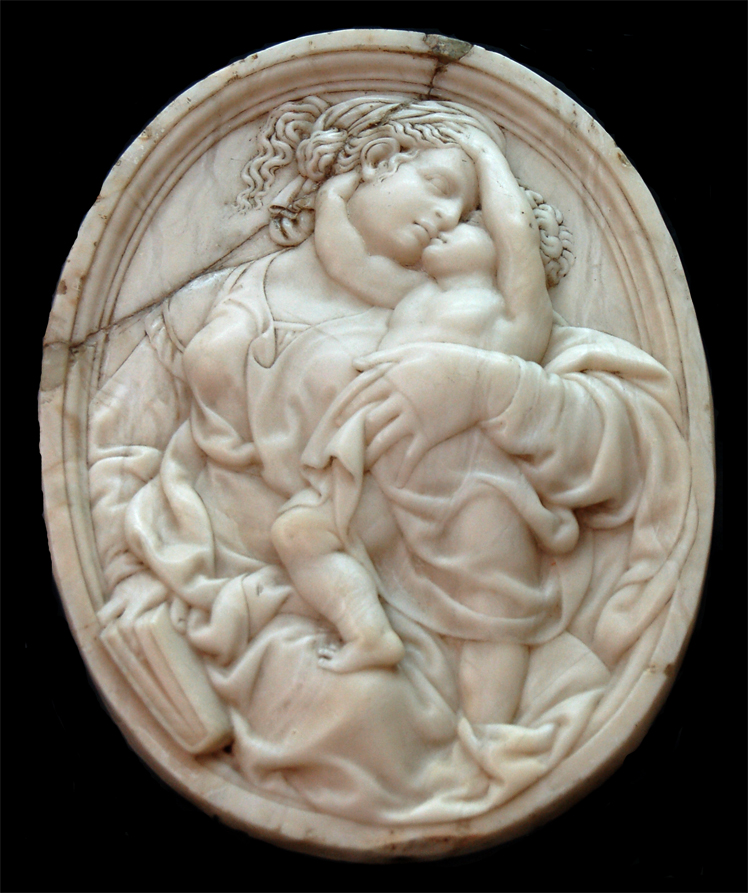 Tondo en alabastro, de pequeñas dimensiones, que en origen debió estar policromado, en el que se recoge una escena de la Virgen sentada, con el niño, con una composición llena de movimiento y detalles que llega a salir de los márgenes marcados por el listel que hace de marco a la obra. No se ha concretado su cronología. / Extraído de: A.A.V.V.: Instituto Gómez-Moreno (catálogo). Granada, 1992.Bibliografía: (Catálogo Expo.) Carlos V y su ambiente. Toledo,1958, nº 248