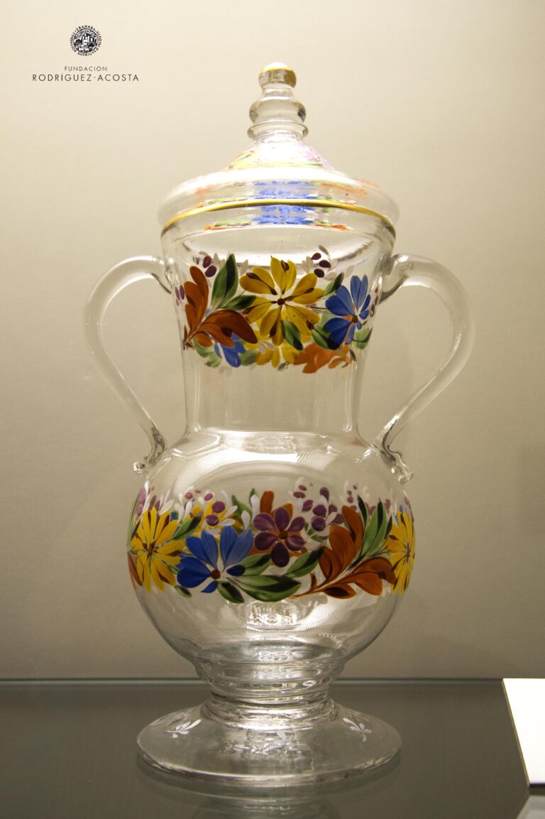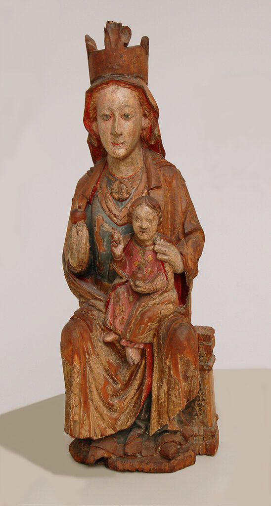 Esta Virgen con el Niño, sedente, fue restaurada por Barbara Hasbach en el año 1990. Su tipología responde a una constante del arte gótico, con raíces en el románico. Además perviven en ella una serie de elementos inamovibles a lo largo de la Edad Media, aunque el estilo vaya evolucionando. El Niño, emplazado frontalmente sobre el regazo de María, viste saya talar de pliegues paralelos cubierta parcialmente por el manto. Bendice con la diestra en tanto que apoya sobre la rodilla izquierda, el libro cerrado sobre cuya tapa se leeen tres líneas: ihs, en catacteres minúsculos latinos, xps, en griego y debajo A (alpha) y O (omega), referencia directa a Cristo como Sabituría total, principio y fin, síntesis del texto juaneo de la gran filacteria que porta el Niño del expléndido ejamplar de Irache, que después de la antífona de Navidad, dice: Ego sum alpha et omega, primus et novissimus dominus. Ello, junto al sibolismo del material, confiere a la obra un carácter metafísico, divino, que trasciende la realidad terrena para inscribirse en ambiente ultraterreno, donde el brillo y luminosidad de la plata presta a la obra el continente intemporal que caracteriza este tipo de imágenes sagradas. La disposición de los personajes responde al tipo de Virgen como «trono de Sabiduría», que es Cristo. Aunque analizado el tipo en ejemplares de madera, es extrapolable con toda justificación a un material noble como la plata. Los ejemplos son numerosos en el arte románico y perviven durante el primer arte gótico, en que se inicia la humanización de los personajes, como se evidencia en el ejemplar toledano, encuadrable en el arte 1200, con ostensible influencia bizantina. Ambos personajes tiene rostro y manos de madera repintada en época posterior, como la corona que luce el Niño, un grueso arco cilíndrico basto, que imita lejanamente la corona de la Virgen. / Extraído de: Angela Franco Mata: «Una Virgen entronizada con Niño, gótica, de posible origen leonés, en el Instituto Gómez Moreno, de Granada», en De Arte, 7, 2008, pp. 77-92.