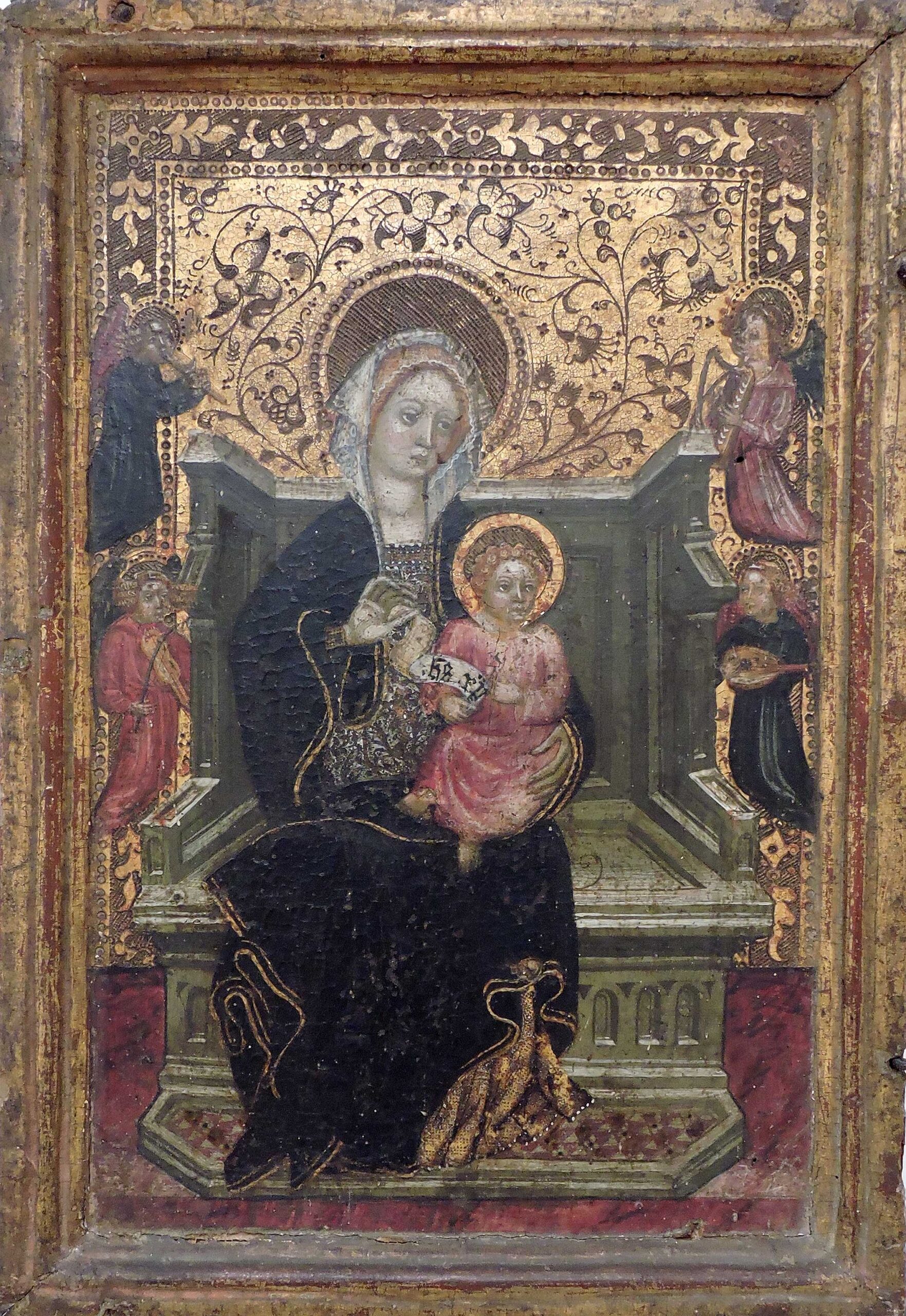 Pintura sobre tabla en la que se representa a la Virgen, entronizada, que mantiene al Niño sobre las piernas. El desplazamiento del grupo hacia la izquierda y el tamaño del trono delatan el interés del pintor por realzar el significado de este elemento simbólico. EL trono está flanqueado por cuatro ángeles músicos, dos en cada lateral. El fondo dorado, presenta una decoración grabada a modo de tapiz de tema vegetal. El marco está tallado en la misma tabla. Pueden verse los enganches en el lateral que denotán que perteneció a un tríptico. Regalo de D. José Weisbérger a D. Manuel Gómez-Moreno Martínez. / Extraído de: A.A.V.V.: Instituto Gómez-Moreno (catálogo). Granada, 1992, p. 144