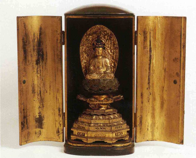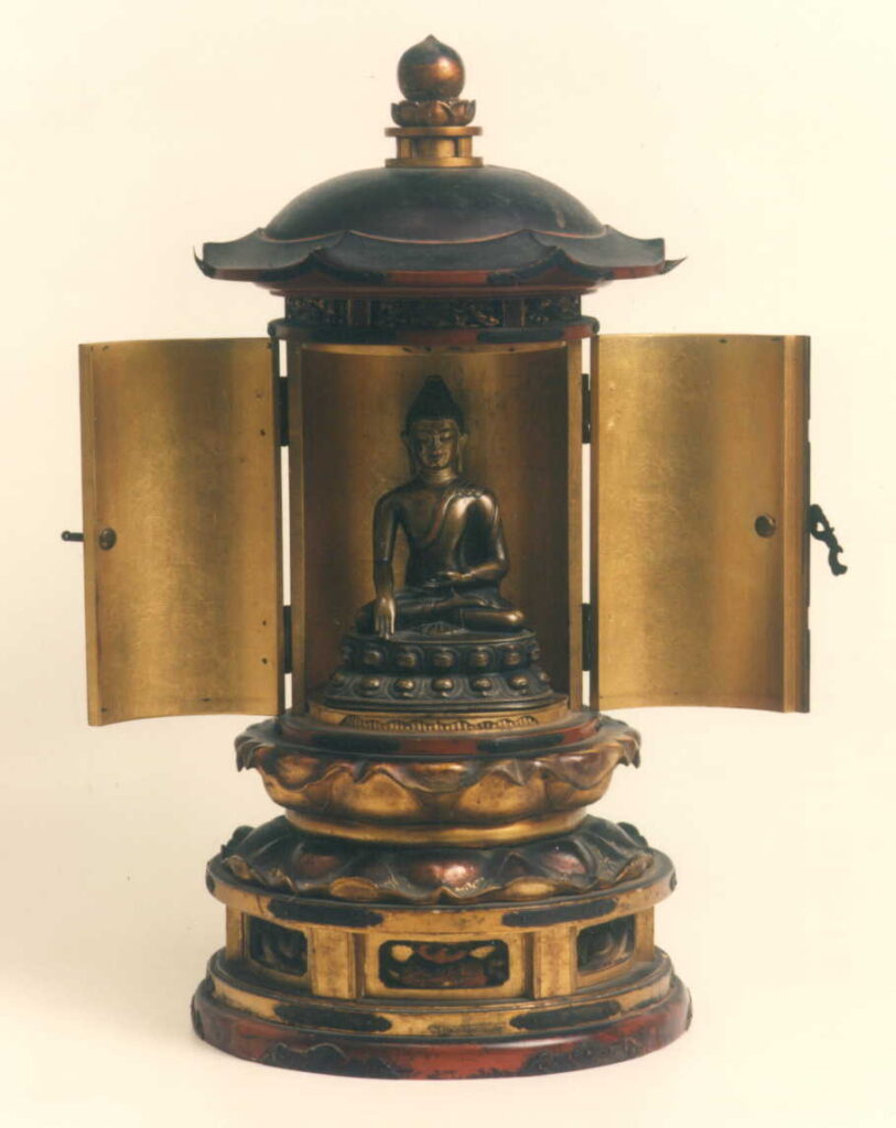 En un pequeño altar portátil de origen japonés, se encuentra la figura en latón con incrustaciones de cobre de AKSHOBHYA realizada en Tibet en el siglo XVI. El Buda aparece sedente realizando con sus manos el gesto llamado “bhumisparsa mudra” ?tomando a la tierra por testigo?, sobre un trono de dos filas de loto con contarios en la parte inferior y superior. La túnica refuerza el sentido escultórico de la imagen debido a su cualidad transparente, destacando el borde exterior de la misma, realizado en cobre, que recorre el pecho y el brazo izquierdo. El altar en forma de linterna, es de base circular, recordando en su base y su tope la forma del loto. El interior del altar se presenta dorado, contrastando con el lacado rojo de su parte exterior, sobre el que se han realizado vistosos herrajes. I.C.F. / R.C.M. / Extraído de: Isabel CERVERA FERNÁNDEZ: Fundación Rodríguez-Acosta. Colección de Arte Asiático. Granada, 2002.Bibliografía: COMAS, R.: El arte del Himalaya en las colecciones españolas: los bronces. Madrid, 1993, p. 365.