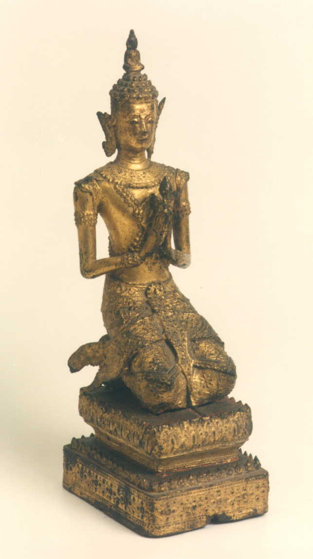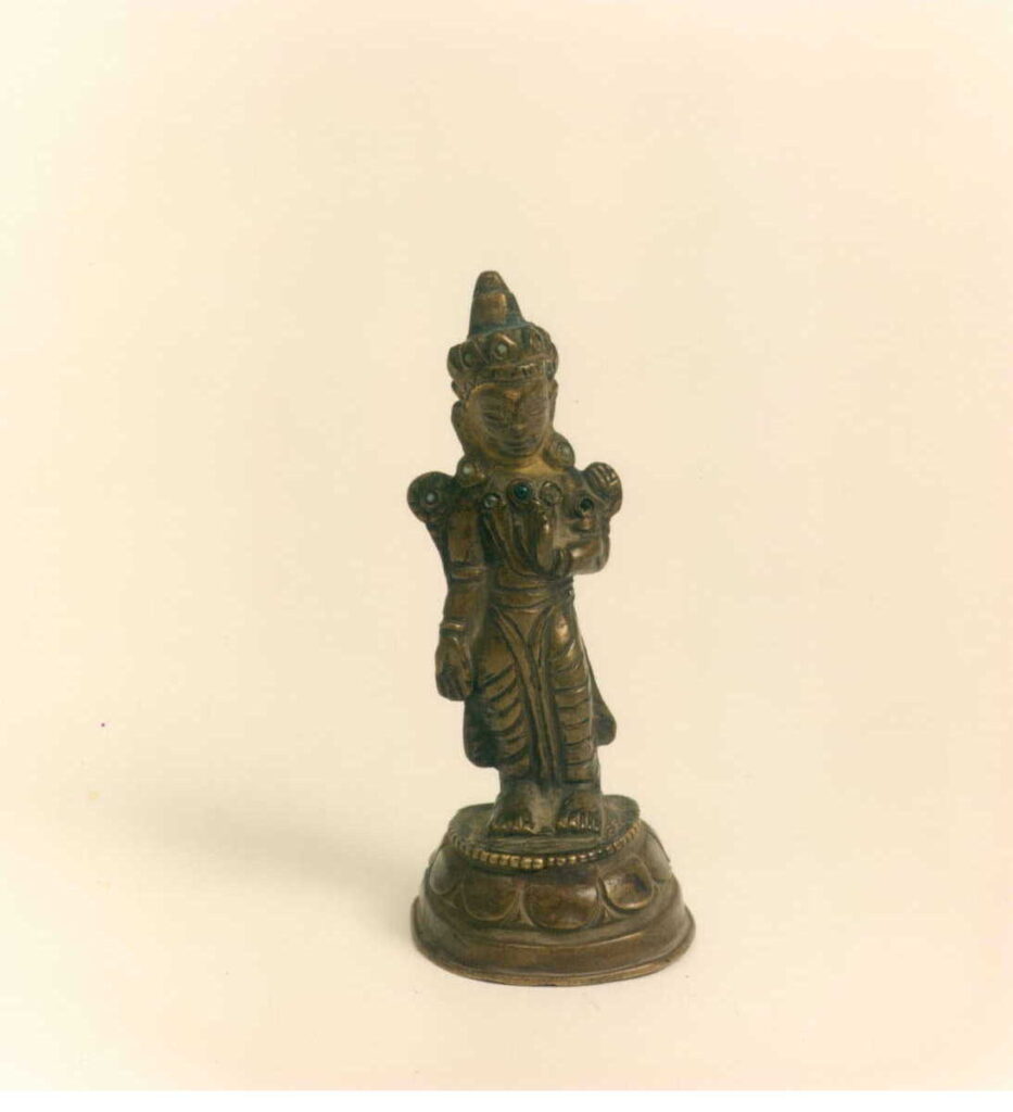 Imagen del bodhisattva Avalokitesvara en su aspecto Padmapani, “el que lleva el loto”, de pie con ligera flexión (abhanga) con dos lotos a la altura de los hombros, la mano derecha en varada mudra, gesto de generosidad, y la izquierda en abhaya mudra, gesto de no temor. Es una figura con la cabeza de tamaño desproporcionado respecto al cuerpo y expresión sonriente. Lleva corona de cinco picos, pendientes, brazaletes, pulseras y collar con piedras incrustadas, así como en el loto de la derecha. Viste una túnica larga con pliegues entre las piernas y en los laterales. Esta sobre una base de una sola fila de pétalos de tipo de “alcachofa”, con un contario en la parte superior. Un rasgo a destacar en esta pieza, característico del Tibet occidental, es el presentar la parte posterior hueca salvo la base que es plana. Esto es debido a que ha sido fundida con un molde muy plano de indica que se hizo para ser colocada adosada a una pared. Por sus características, en particular los pétalos de “alcachofa” de la base, así como los pliegues de la túnica con incisiones profundas y paralelas, y los pies grandes muy planos, la imagen se localiza en la zona occidental del Himalaya, quizás incluso en el propio Tibet occidental (Ladakh). Sin embargo, por su aspecto tosco podría tratarse de una obra realizada tardiamente imitando un estilo anterior. R.C.M. / Extraído de: Isabel CERVERA FERNÁNDEZ: Fundación Rodríguez-Acosta. Colección de Arte Asiático. Granada, 2002.Bibliografía: COMAS, R.: El arte del Himalaya en las colecciones españolas: los bronces. Madrid, 1993, p. 355.
