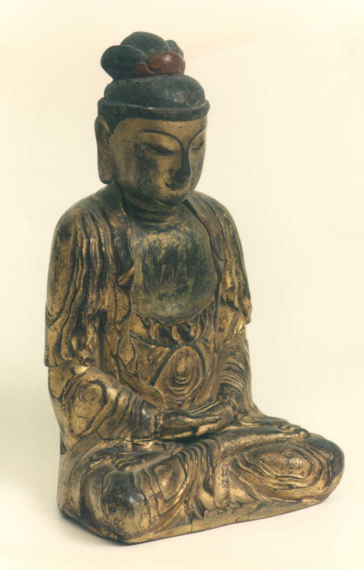 El Buda sedente, con la mudra upadesa o discusión de la doctrina, señala la majestad, sabiduría e iluminación de Amida. El desarrollo de la flor de loto del trono de Buda, y la doble aureola que rodea su rostro y cuerpo enfatizan la dignidad espiritual del personaje. I.C.F. / Extraído de: Isabel CERVERA FERNÁNDEZ: Fundación Rodríguez-Acosta. Colección de Arte Asiático. Granada, 2002.