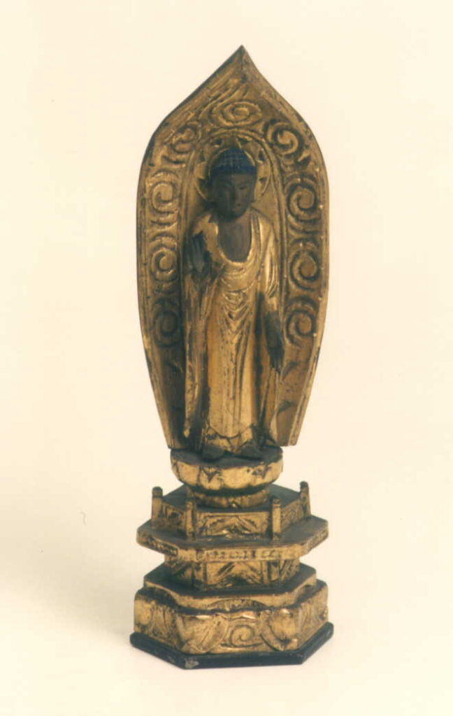 Amida de pie sobre un trono múltiple compuesto por una estructura triple a modo de terraza, sobre la que se ubica el verdadero trono de Buda, la flor de loto. Amida realiza con sus manos el gesto de abhaya-mudra o protección y se enmarca en un halo en forma ojival con decoración de roleos. I.C.F. / Extraído de: Isabel CERVERA FERNÁNDEZ: Fundación Rodríguez-Acosta. Colección de Arte Asiático. Granada, 2002.