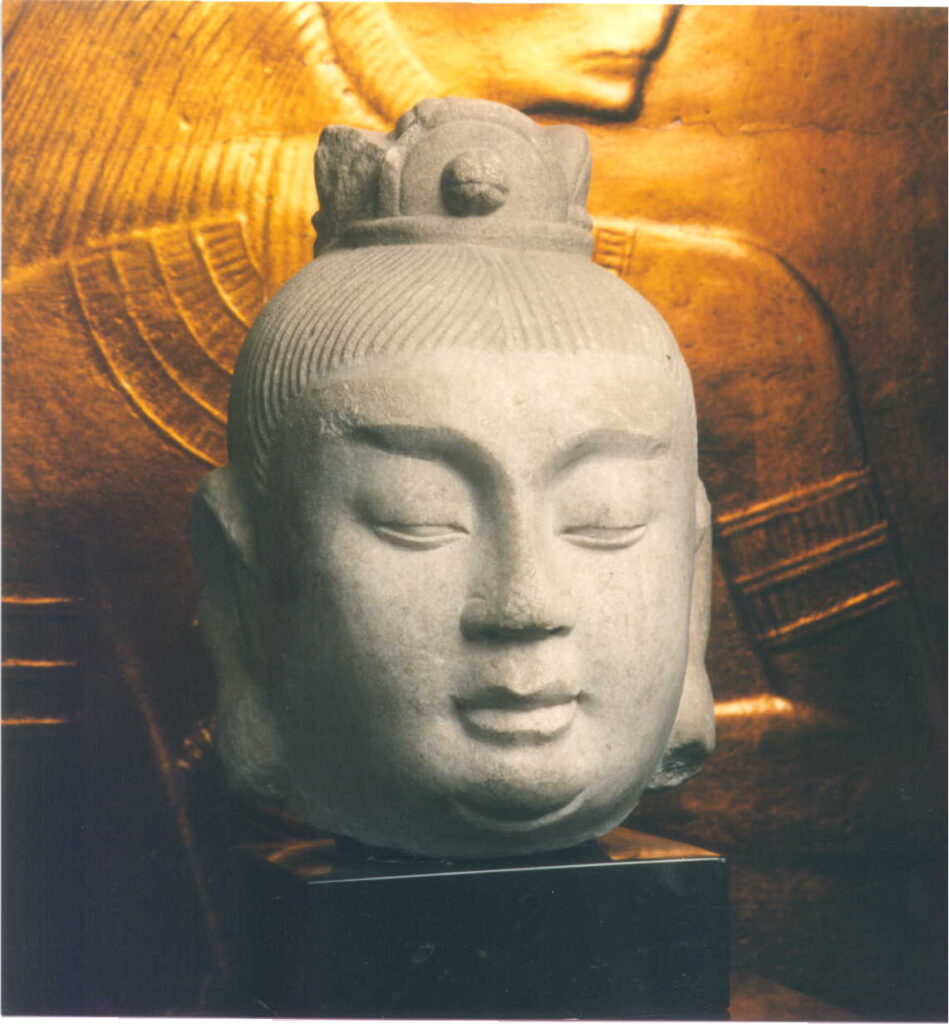Esta talla incompleta pertenece a una divinidad de origen taoísta o confuciano. La ausencia de rasgos iconográficos en el rostro y el no poder ser estudiada como parte de una imagen completa, hace difícil su catalogación. A primera vista mantiene el modelo de las divinidades budistas, con una expresión de serenidad y complacencia espiritual, señalada por la mirada y la sonrisa apenas esbozada. Sin embargo dos de los atributos básicos de estas imágenes, la urna o señal circular en el entrecejo y la unisha o moño con el que se recogen las divinidades budistas el cabello en la nuca, aparecen claramente desvirtuadas. En este caso, el cabello se recoge en un moño y éste se cubre con una pequeña tiara, atravesada por un pasador, del que sobresale el nudo central, característico de la antigua indumentaria de letrados. I.C.F. / Extraído de: Isabel CERVERA FERNÁNDEZ: Fundación Rodríguez-Acosta. Colección de Arte Asiático. Granada, 2002.