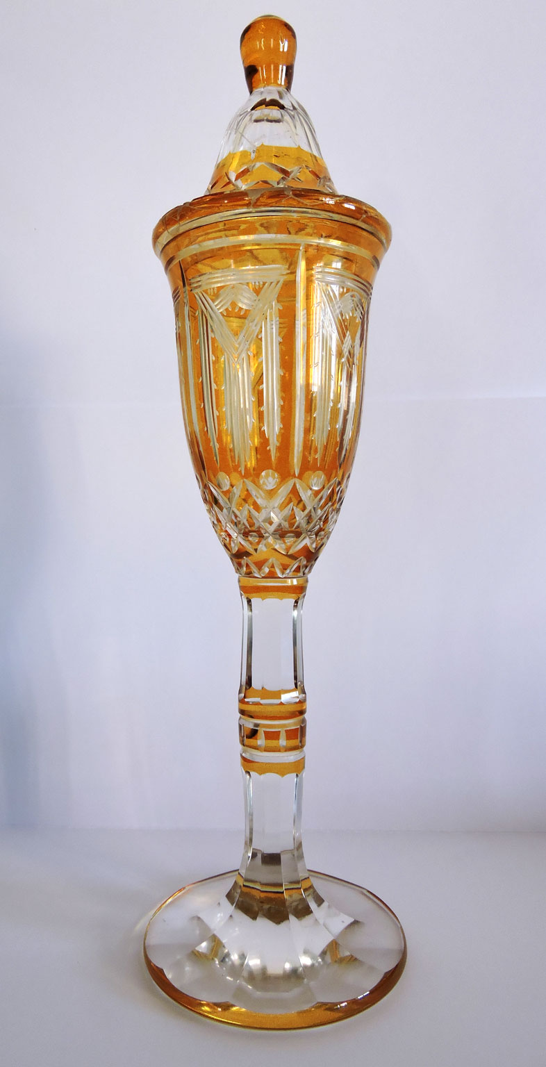 Copa de cristal con tapadera: Cristal incoloro y ámbar. Cuerpo y tapa globulares con decoración grabada de gusto Art Nouveau sobre pie alto facetado.Fabricado por Haida (Novy Bor, Bohemia)Altura total: 33,5 cm, diámetro (máx.): 8,5 cm.