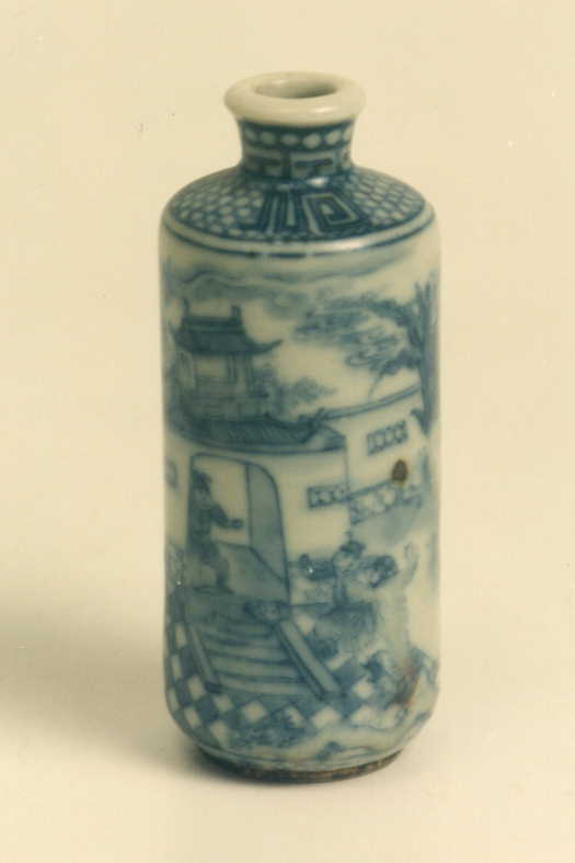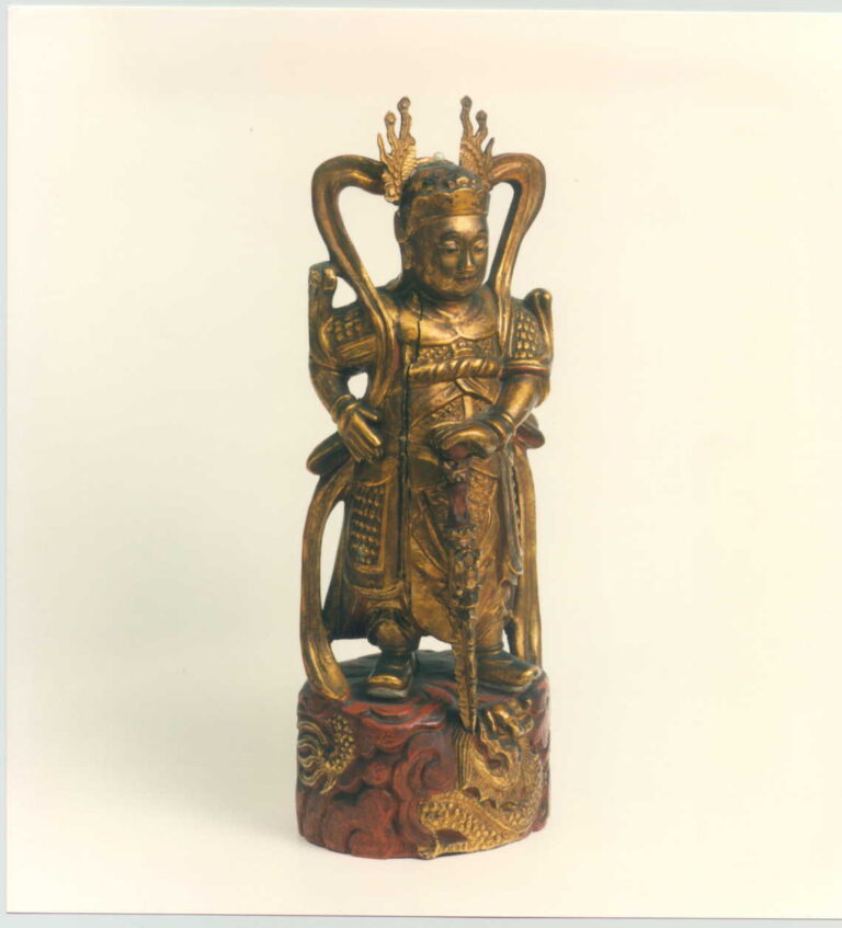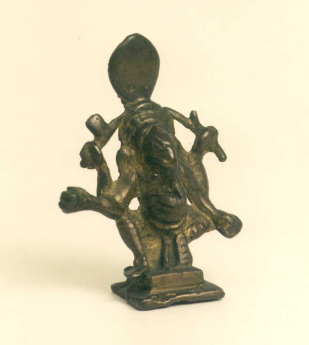 Se trata de una pequeña imagen de Ganesha, el dios con cabeza de elefante, hijo de Siva y Uma, y muy popular tanto en India como en Nepal por ser considerado portador de buena suerte. En esta representación aparece con cuatro brazos que sujetan sus atributos apenas reconocibles, entre los que suelen estar el colmillo roto, el hacha de guerra y el cuenco con dulces. Lleva una corona con decoración radial (que podría tener su origen en la deformación de la primitiva aureola) y un nimbo ovalado muy alto. Tiene el vientre prominente característico de esta divinidad, la trompa se curva hacia la derecha, y se sienta en maharajalilasana, posicion relajada, sobre un trono cuadrado, tomando un aire estático propio del icono frente a la postura dinámica en que aparece en otras ocasiones. La fundición, así como la representación de los detalles es bastante burda, y del tipo de las obras producidas en el Himalaya occidental, probablemente en Himachal Pradesh. Existen abundantes ejemplos atribuidos a esta zona con la misma iconografía. R.C.M. / Extraído de: Isabel CERVERA FERNÁNDEZ: Fundación Rodríguez-Acosta. Colección de Arte Asiático. Granada, 2002. Bibliografía: COMAS, R.: El arte del Himalaya en las colecciones españolas: los bronces. Madrid, 1993, p. 356.
