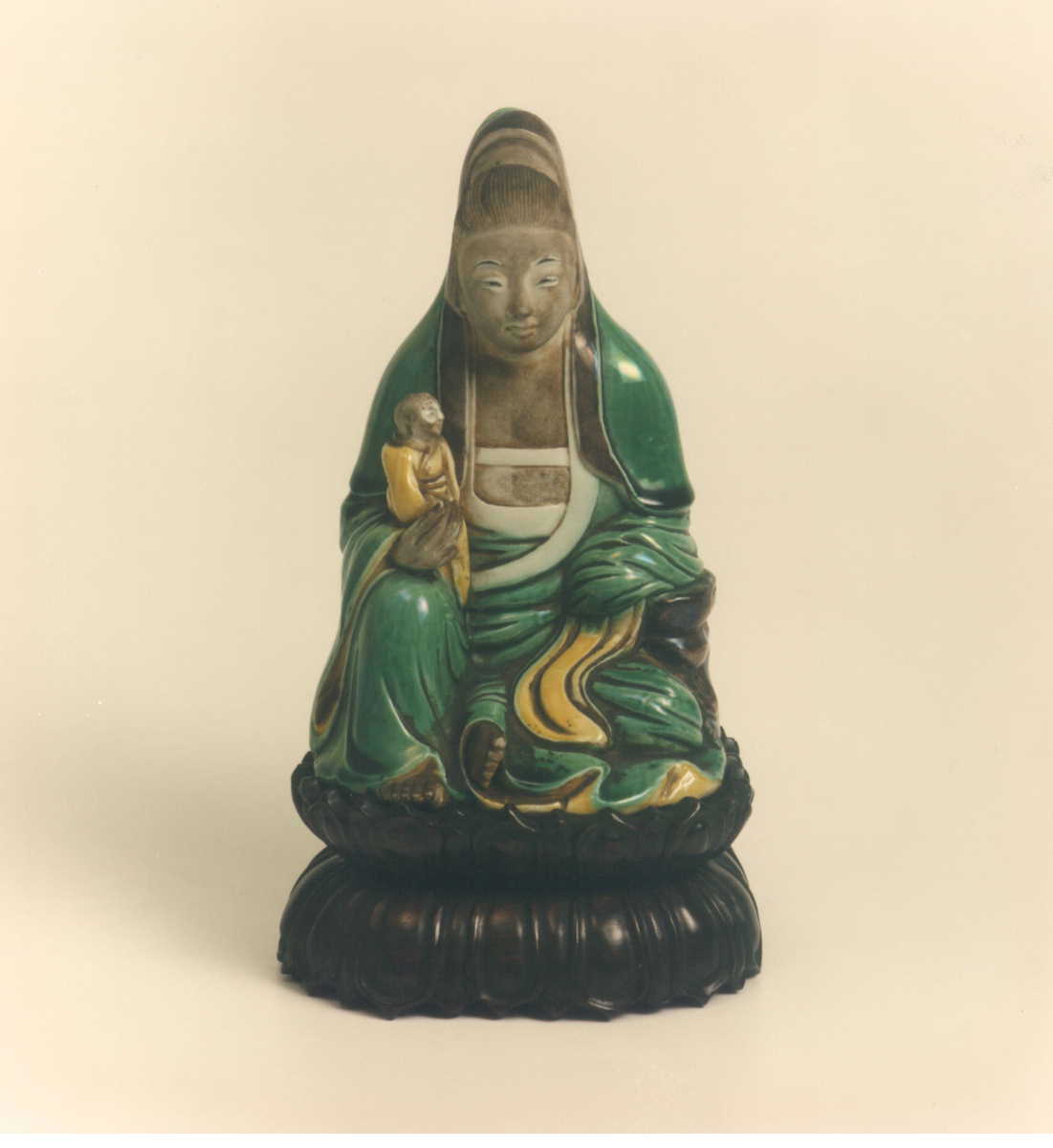 Esta pieza muestra una imagen de la divinidad en la que se potencia el concepto maternal al sostener un niño sobre su pierna derecha, casi ajeno a la imagen de la diosa. Ésta se muestra encorvada y frontal al espectador, cubierta la cabeza por un manto que recubre los hombros, y una túnica que se resuelve en complejos pliegues desde el talle a los pies. I.C.F. Extraído de: Isabel CERVERA FERNÁNDEZ: Fundación Rodríguez-Acosta. Colección de Arte Asiático. Granada, 2002.
