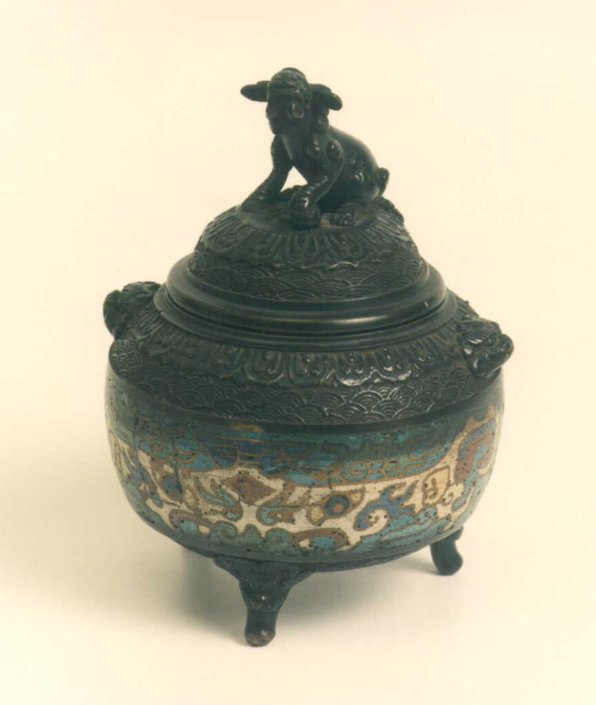 Entre los objetos de uso ritual utilizados por las diferentes creencias en China, son muy frecuentes los incensarios y campanas, cuyo origen se encuentra en los bronces rituales de las dinastías Shang (1765-1122 a.C.) y Zhou (1121-221 a.C.). Este incensario se presenta con tapa, realizada en bronce y con franja decorativa en esmalte cloisonné. De formas proporcionadas, esta pieza se remata con una tapa cuyo pomo al igual que las pequeñas asas y las tres patas han adquirido la forma de un leon. La decoración tanto de la tapa como de los hombros de la pieza recoge los motivos tradicionales utilizados en los objetos cortesanos, como son las olas, tratadas de un modo esquemático con semicírculos concéntricos y los llamados “cuellos de nubes”, procedentes de la decoración cerámica. La franja decorativa realizada en esmalte, contrasta por su policromía con el bronce, así como por el uso de temas de gusto arcaizante como es el caso de la mascara de animales o “taotie”, que recorre de un modo esquemático toda la pieza. I.C.F. / Extraído de: Isabel CERVERA FERNÁNDEZ: Fundación Rodríguez-Acosta. Colección de Arte Asiático. Granada, 2002.