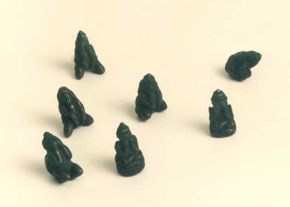 Conjunto de siete pequeñas piezas, realizadas en plata, representando figuras humanas sedentes o arrodilladas que ocultan su rostro con las manos. Su significado y uso es incierto pudiendo haber sido utilizadas como objetos votivos en ceremonias de corte popular. I.C.F. / Extraído de: Isabel CERVERA FERNÁNDEZ: Fundación Rodríguez-Acosta. Colección de Arte Asiático. Granada, 2002. Bibliografía: A.A.V.V.: Masterpieces from the National Museum Collection. Nueva Delhi, 1985, p.143.