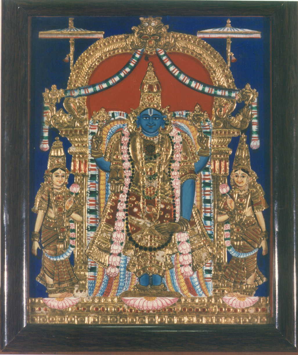Pintura sobre cristal característica de la producción de la ciudad de Tangalore. Este tipo de imaginería de carácter religioso se adorna con incrustaciones de cristal, esmaltes y dorados, otorgándole mayor valor decorativo a la obra. Krishna es una divinidad hindú, considerada el octavo avatar del dios Vishnú, representada frecuentemente en el arte popular hindú. Su popularidad nace de su presencia a partir del siglo XIV en el arte de la miniatura no sólo hindú, sino incluso en la de corte mogol. Su leyenda narra cómo nació hijo de príncipes, abandonado en una cesta en el río, debido a las amenazas de su tío bajo la profecía de que un sobrino suyo le daría muerte. Para salvarse de la matanza de niños ordenada, Krishna es abandonado en una cesta sobre el río Yamura. Él y su hermano fueron recogidos por una pareja de pastores que les criará hasta su toma de conciencia histórica. Mientras se mostrará como un niño con poderes sobrenaturales con los que sorteará todo tipo de peligros. Criado como favorito de los dioses, gusta de bailar y cantar entre las pastoras (gopis), siendo muy famosos sus episodios amorosos. La profecía se cumplirá, y Krishna mata a su tío, casándose posteriormente con la princesa Rukmini. El color azul del cuerpo de Krishna es uno de sus signos de identificación, así como sus representaciones como músico y bailarín. En este caso se le ha representado en su majestad divina, flanqueado por dos de sus saktis o energías femeninas, consideradas también como sus esposas. I.C.F. / Extraído de: Isabel CERVERA FERNÁNDEZ: Fundación Rodríguez-Acosta. Colección de Arte Asiático. Granada, 2002. Bibliografía: A.A.V.V.: National Handicrafts and Handlooms Museum. Nueva Delhi, 1989, p.119.