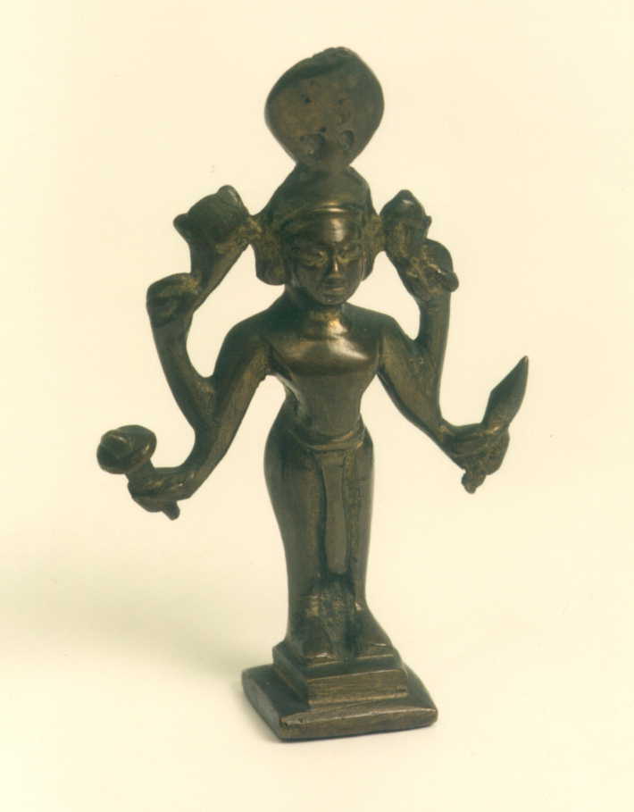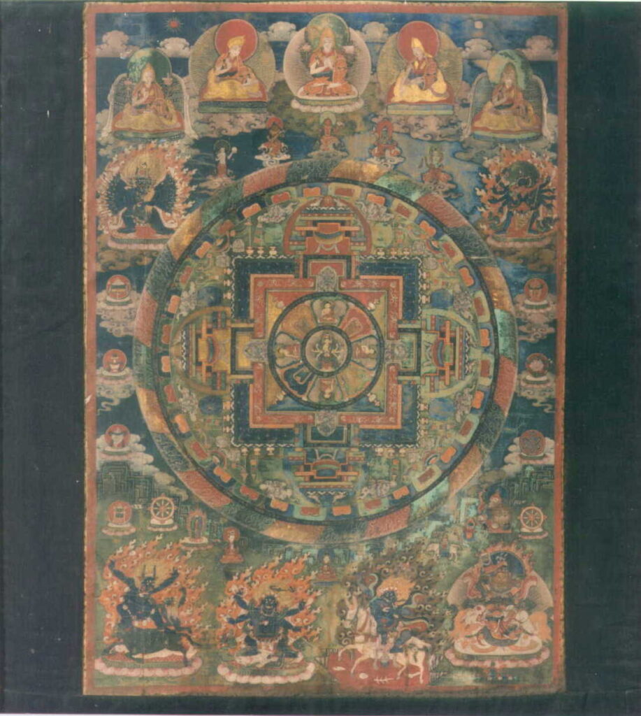 Mandala significa literalmente en sánscrito “círculo”. En origen designa las diez visiones del Rig Veda, como formas bi o tridimensionales del cosmos. Su objetivo y finalidad principal es servir de soporte a la meditación mediante la representación de un diagrama mágico compuesto de formas geométricas. En las representaciones plásticas del tantra y el budismo Vajrayana, las formas geométricas en ocasiones se sustituyen por la representación de una divinidad. En este mandala múltiple, la divinidad está situada en el centro de la composición rodeada de figuras laterales inscritas en un primer círculo y a su vez éstas en un cuadrado. Éste simboliza la planta de un palacio con sus puertas ubicadas en los cuatro puntos cardinales. A su vez está rodeada de un círculo formado por pétalos de flor de loto –en clara referencia al budismo, y un círculo externo que alude al fuego y a la luz de la espiritualidad. Todo ello se enmarca en un rectángulo, con dos zonas bien diferenciadas, la inferior con cuatro divinidades que hacen alusión al mundo terrenal, y la superior con cinco imágenes de maestros de la secta gelukhpa. En los laterales, aparecen divinidades menores y objetos simbólicos.Todos los elementos representados ya sean dioses, personajes esotéricos, maestros y lamas, objetos y animales, funcionan en esta composición tipo mandala como símbolo o alusión a la idea general que no es otra que mostrar el linaje espiritual de Tsonkhapa fundador de la secta reformadora Gelukpa. Su ubicación, sus gestos, atributos y colores utilizados ayudan a comprender al fiel el significado último del thanka y por tanto de su uso como medio tanto de iniciación al conocimiento como de soporte de meditación, en sentido “yóguico”.Siguiendo el esquema geométrico que utiliza el artista, podemos realizar una lectura iconográfica de los elementos que conforman esta obra. Así vemos que el personaje más relevante por su ubicación en el centro superior del thanka, la iluminación que el artista le ha conferido e incluso el tamaño respecto a otras figuras, es Tsongkapa personaje al que también están dedicados los Thangkas de esta colección nº. 1 y 2. El reformador espiritual está sentado sobre un trono en forma de flor de loto, con su característico gorro amarillo, su indumentaria de monjes y sus atributos que le relacionan con la reencarnación de Mansjuri (ver. Cat.nº.2). Como el resto de las cuatro figuras que le acompañan, muestra un halo espiritual enmarcando su cabeza, como signo de su fuerza espiritual y otro exterior que encuadra toda la figura. En el caso de Tsongkapa, así como en el de los dos personajes laterales se ha utilizado en el halo interno el color verde, mientras que las dos figuras que le flanquean directamente presentan una aureola de color rojo. Estos dos personajes que se giran, con un leve movimiento hacia él se identifican el de su derecha con el primer Panchen Lama (1569-1662) y Gendun Drupa su ziquierda., mientras que las dos figuras externas se corresponden con Butön Rinchen Drup (1290-1364), abad del monasterio de Shalu, a la derecha de la composición, y otro maestro de las enseñanzas gelukhpa, llamado Skaya Pandita (1182-1251).Todos estos personajes se ubican sobre nubes que junto con el color azul del fondo y la aparición del sol y la luna aluden al estadio celestial identificado físicamente con el firmamento. En el plano inmediatamente inferior, encontramos de nuevo cinco figuras, de menor tamaño. Todas ellas son representaciones de seres divinos o divinizados, según se aprecia por el halo de luz que les enmarca sus cabezas. Los dos que aparecen en los extremos, están de pie sobre una pequeña nube. El del extremo derecho, va vestido como un monje y lleva en su mano izquierda un pequeño cuenco que ofrece, con un giro de su cuerpo a la divinidad principal. Flanqueando la figura principal, dos imágenes bailando sobre nubes, y en el centro la imagen principal, bajo los pies de Tsongkapa, manifestando la línea imaginaria y simbólica de unión entre él y la deidad principal del mandala, Avalokitesvara.A derecha e izquierda de estos cinco personajes descritos, las imágenes terroríficas de dos guardianes y protectores. En ambos casos están pintados de azul, con múltiples brazos y atributos en sus manos. De pie sobre una flor de loto, se mueven agitando sus brazos, indicando su carácter omnipotente manifestado tanto en su movimiento cósmico como en las armas y atributos que portan.Bajo ellos y en los laterales utilizados como transición entre la esfera espiritual y la terrestre, aparecen los Ocho Objetos Budistas. En el lateral izquierdo y de arriba abajo, el parasol, símbolo de la dignidad regia, la vasija que contiene el néctar de la inmortalidad, la concha, símbolo de la victoria en la lucha. En el lateral derecho y siguiendo el mismo orden nos encontramos, con una pareja de peces, signo de Buda, la flor de loto, asociada a la pureza y el nudo místico de la inmortalidad. En ambos laterales la rueda de la doctrina, que en el lateral izquierdo aparece acompañada de la bandera, alusión a la victoria de la religión e imágenes de personajes asociados a la vida de Tsongkapa.Como cierre a esta visión cósmica, cuatro guardianes o dharmapalas nos ofrecen sus expresiones más agresivas, como protectores del espacio sagrado y defensores de la doctrina. Cada uno de ellos se apoya, pisa o cabalga sobre un animal o persona aludiendo con ello a diferentes direcciones y sus correspondientes simbologías. Todos ellos se envuelven en un halo de fuego destructor y llevan múltiples atributos en sus brazos y como adornos corporales, como pueden ser calaveras, armas, etc.Los cuatro tienen su origen en India, pero en Tíbet sufren diferentes transformaciones simbólicas e icográficas en contacto con tradiciones locales, las tantra indias e incluso en los últimos períodos de las tradiciones mongolas. Por ello es frecuente que apa