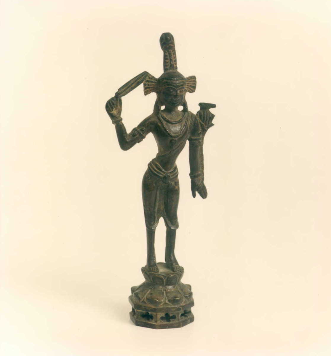 Imagen del bodhisattva Mansjuri “el de la dulce apariencia”, encarnación de la sabiduría, de pie en abhanga o ligera flexión con sus atributos característicos. En la mano derecha sujeta la espada (khadga), el arma que lucha contra la ignorancia, y en la izquierda el loto azul símbolo de la inteligencia sobre el que reposa el libro o manuscrito sagrado (pustaka). Lleva un tocado muy alto, característico de las imágenes de la zona occidental (Himachal Pradesh y Ladakh), con cintas laterales en forma de abanico, collares, brazaletes, pulseras, cordón sagrado, y una vestimenta cuyos pliegues llegan hasta las rodillas y cinturón. Se trata de una figura muy estilizada, algo desproporcionada, como es usual en las imágenes de esta escuela, de expresión tranquila como corresponde a este bodhisattva.Se apoya sobre una base poco habitual de dos filas de pétalos de loto de las cuales la inferior es más grande y, a su vez, reposa sobre un soporte horadado con flores estilizadas de cuatro pétalos. La comparación con obras de características similares permite datarlo entre los siglos XII y XIV, época en la que todavía el budismo pervive en la zona de Cachemira. R.C.M. / Extraído de: Isabel CERVERA FERNÁNDEZ: Fundación Rodríguez-Acosta. Colección de Arte Asiático. Granada, 2002. Bibliografía: COMAS, R.: El arte del Himalaya en las colecciones españolas: los bronces. Madrid, 1993, p. 357.