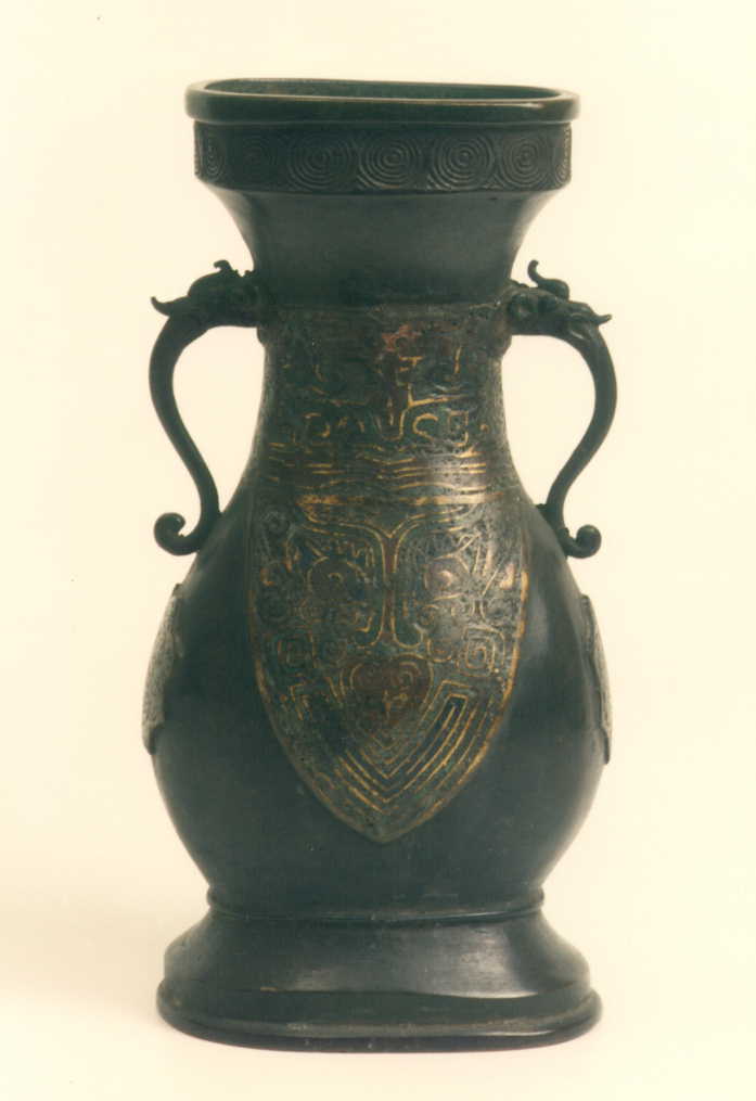 Pareja de jarrones realizados en bronce con decoración realizada en esmalte cloisonné. La forma de esta pieza corresponde al tipo Hu con asas, según la terminología utilizada para la clasificación de los recipientes de bronce rituales correspondientes a las dinastías Shang y Zhou. Durante las dinastías Ming y Qing se produjo un vivo interés por la antigüedad, realizando en los talleres de la corte un importante numero de piezas de bronce de gusto y estilo arcaizante. En ellas, como en el caso de la pareja que nos ocupa, se fusionan tipos, técnicas y motivos decorativos, cuya única finalidad es la belleza de los objetos en si mismos, ignorando su ancestral uso ritual. Estas piezas están decoradas en sus asas con cabezas de elefante siendo precisamente sus trompas las que configuran las asas propiamente dichas. El cuello de las piezas, presenta una decoración realizada con círculos concéntricos, resaltando con ello su sección. El cuerpo de la pieza está decorado con cuatro placas de esmalte cloisoné; la frontal y dorsal presentan un mayor desarrollo frente a las laterales de menor tamaño. En las primeras, volvemos a encontrar el sentido arcaizante anteriormente señalado, al elegir como motivo decorativo principal la imagen de la mascara de animales o “taotie”, característica de los bronces arcaicos rituales. En la base de las piezas se encuentra una marca imperial de reinado (“nianhao”), realizada en estilo sigilar, y en el que se puede leer: Da Ming Xuande nian zhì; “Hecho en el reinado de Xuande de la gran dinastía Ming”. I.C.F. / Extraído de: Isabel CERVERA FERNÁNDEZ: Fundación Rodríguez-Acosta. Colección de Arte Asiático. Granada, 2002.