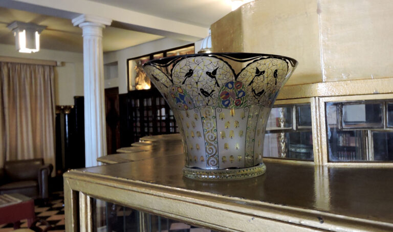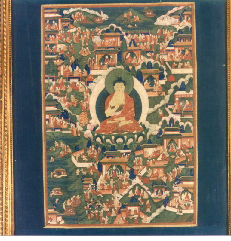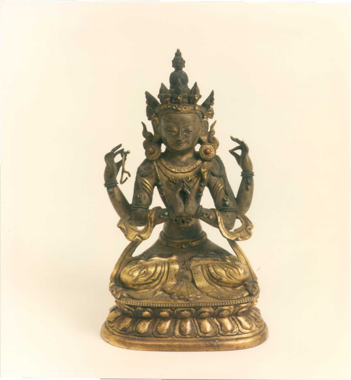 Se trata de la iconografía del Bodhisattva Avalokitesvara en su aspecto Shadakshari Lokesvara. Una cabeza del Buda Amitabha, del que este bodhisattva es una emanación, aparece sobre la ushnisha. Presenta una cara ancha de rasgos achinados con expresión sonriente. Lleva abundantes joyas con incrustaciones de piedras, una falda larga con decoración incisa en los bordes, y un chal.La parte posterior, salvo el trono, está modelada con esmero. La base está formada por dos filas de pétalos de loto, los de la superior más pequeños, y rematada por un contario. La tapa de la base tiene una visvavajra muy borrosa.Se aprecia influencia china en los rasgos de la cara y el chal, pero probablemente se trata de un modelo de tradición nepalí. A. NEVEN, (NEVEN, 1974) analiza una imagen, con otra iconografía pero con rasgos estilísticos similares, y la cataloga también como del Tibet oriental, primera mitad del siglo XVIII. R.C.M. / Extraído de: Isabel CERVERA FERNÁNDEZ: Fundación Rodríguez-Acosta. Colección de Arte Asiático. Granada, 2002.Bibliografía: COMAS, R.: El arte del Himalaya en las colecciones españolas: los bronces. Madrid, 1993, p. 388 / NEVEN, A.: Le trantrisme dans l’art et la pensé. Bruselas, 1974.